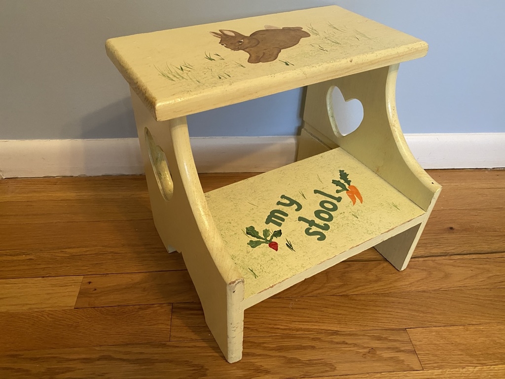 Butter yellow with heart cut-outs at sides, bunny painted on top step with "my stool" painted on bottom.