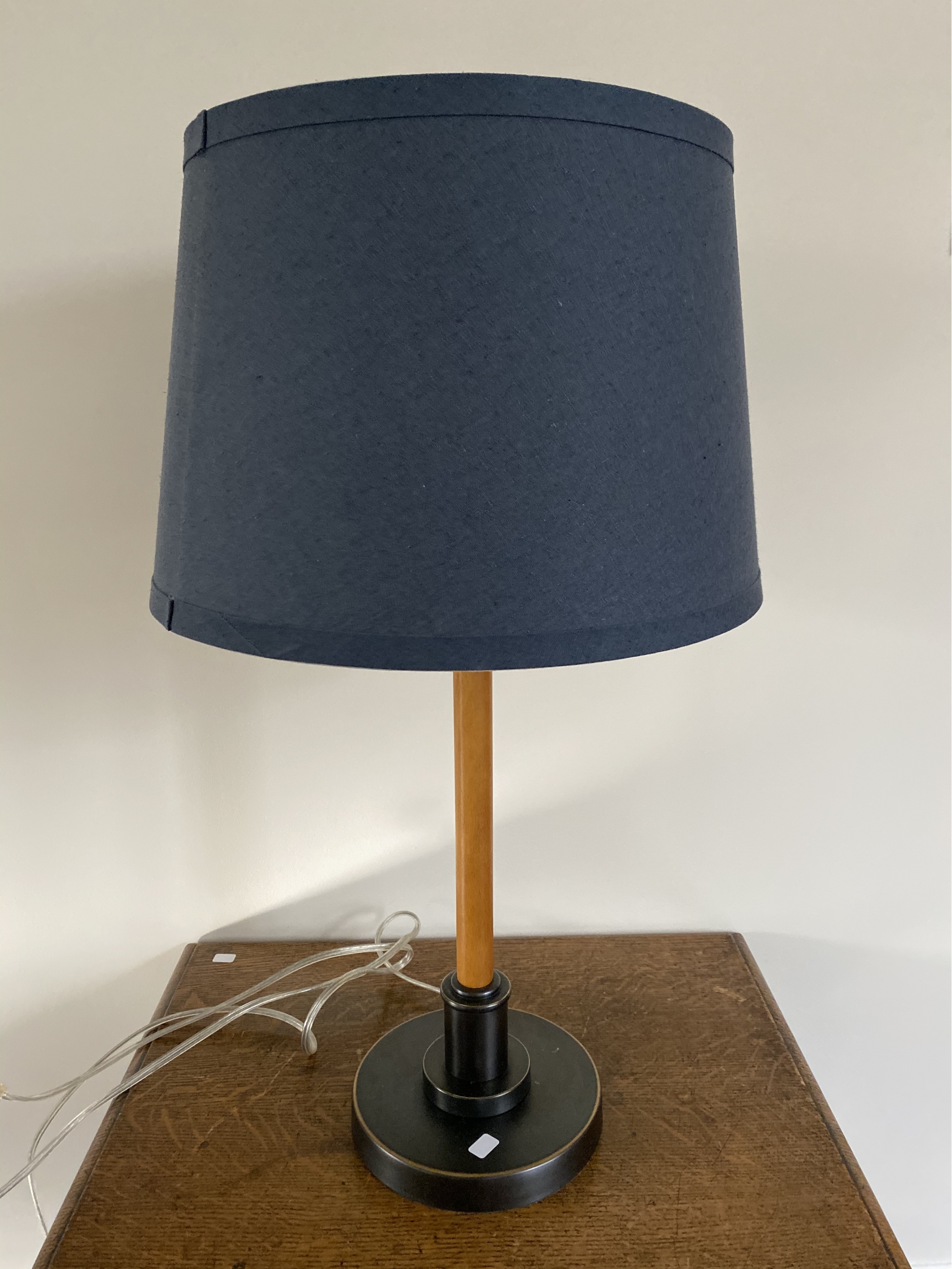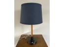 25" high. Wood base with large dark blue shade. Great for an office or boys room.