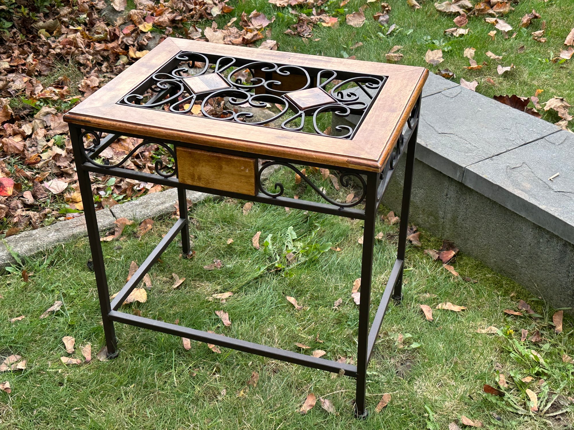 A wood and metal end table, perfect to put a plant. There is no glass so it would not make a great end table as beverages wouldn't balance well.