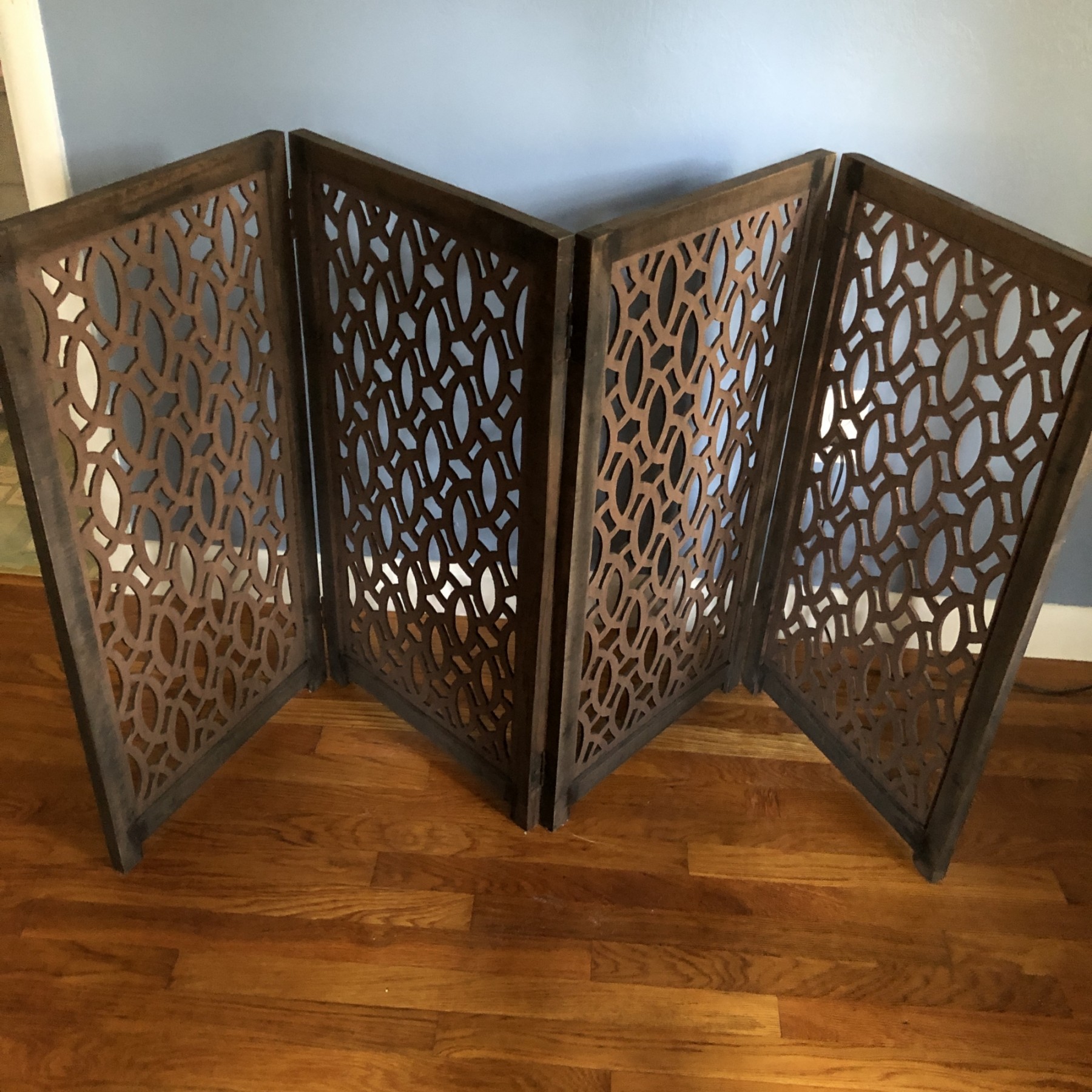 Wooden Folding Gate with 4 sections. Each section measures 33"x17". Total approximate length is 68". Good condition.