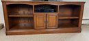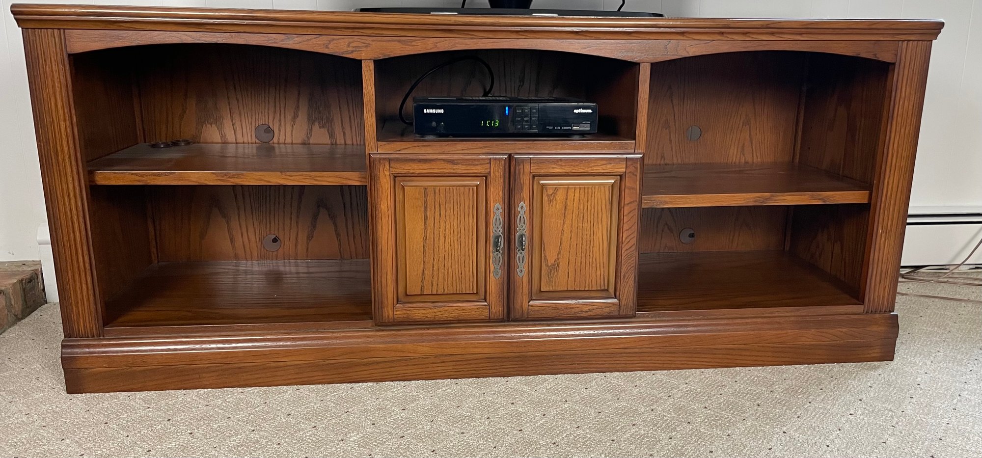 Media stand cabinet piece. Two shelves, cabinet center. Few scratches seen in images. See photos for more conditions and sizing.