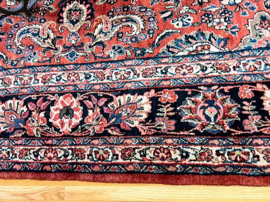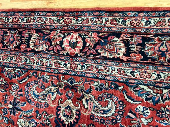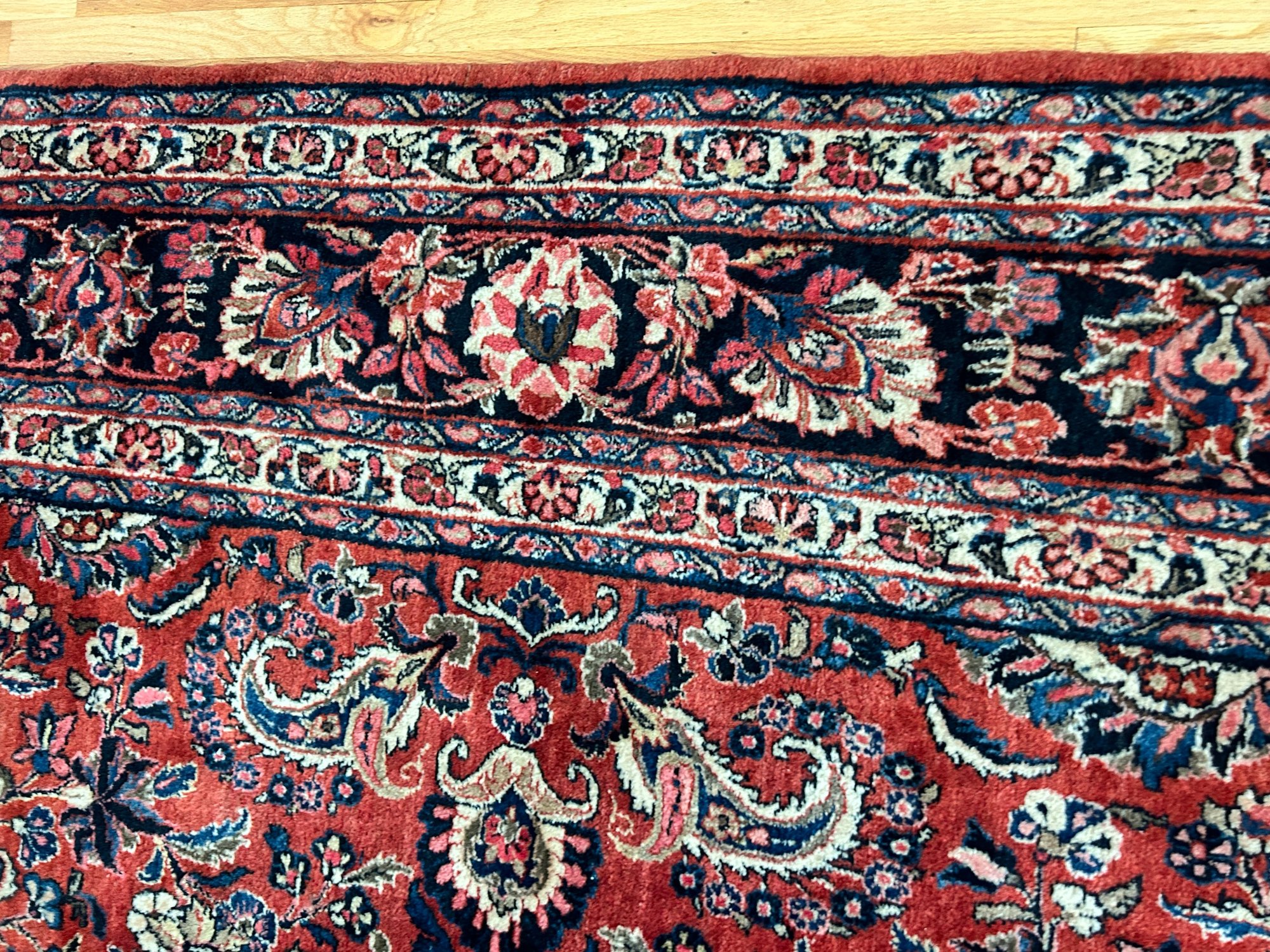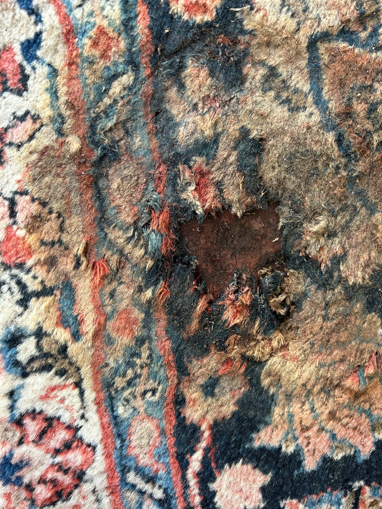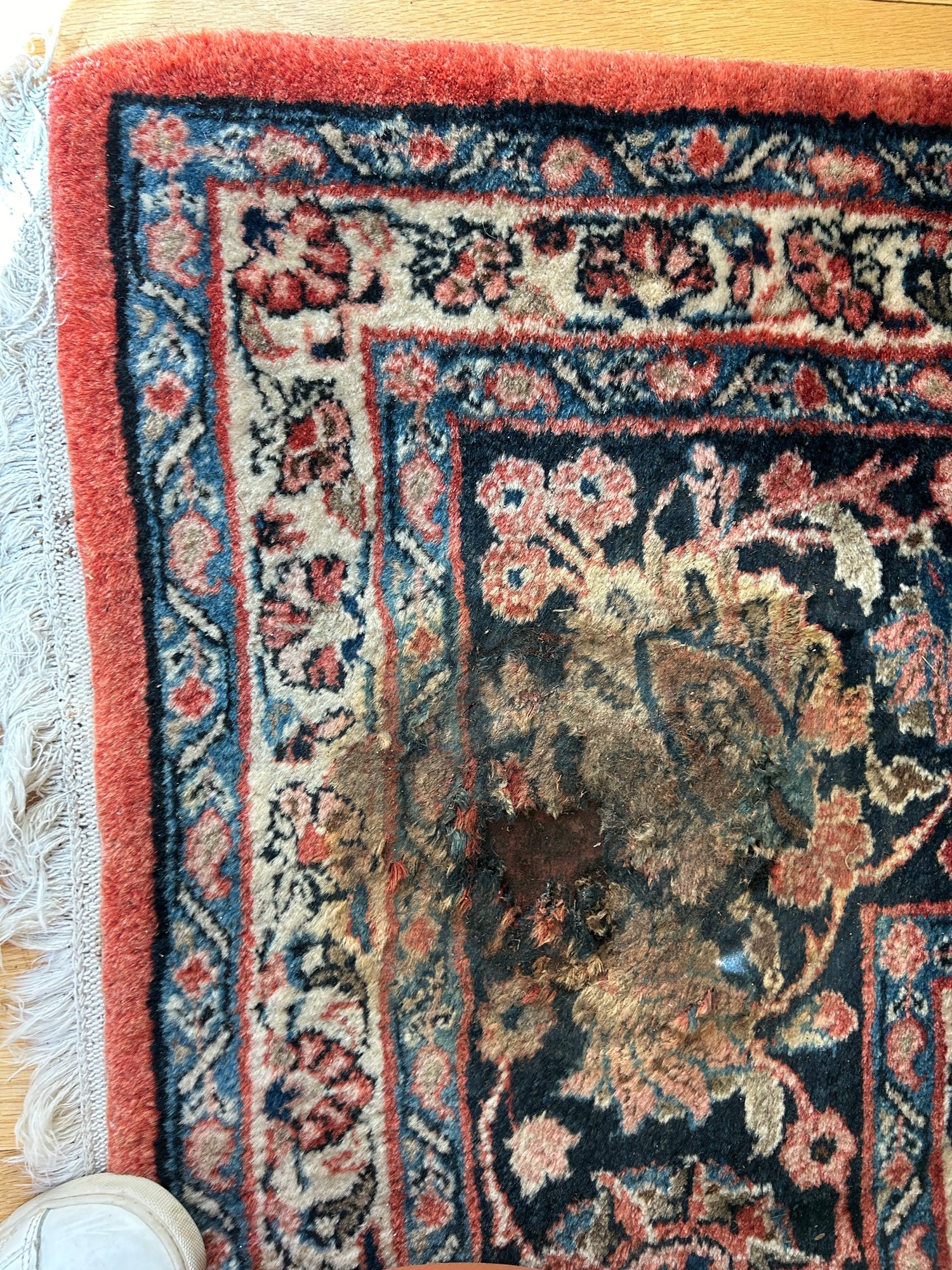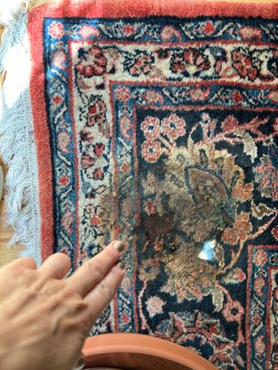 Some wear to edges of rug (see photo). Hole and soiling in one corner - hole is 2" x 2" and soiled area (from watering a plant is 7" x 7"
