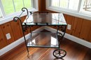 Black wrought iron with leaf design, 2 glass shelves, on wheels.