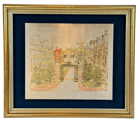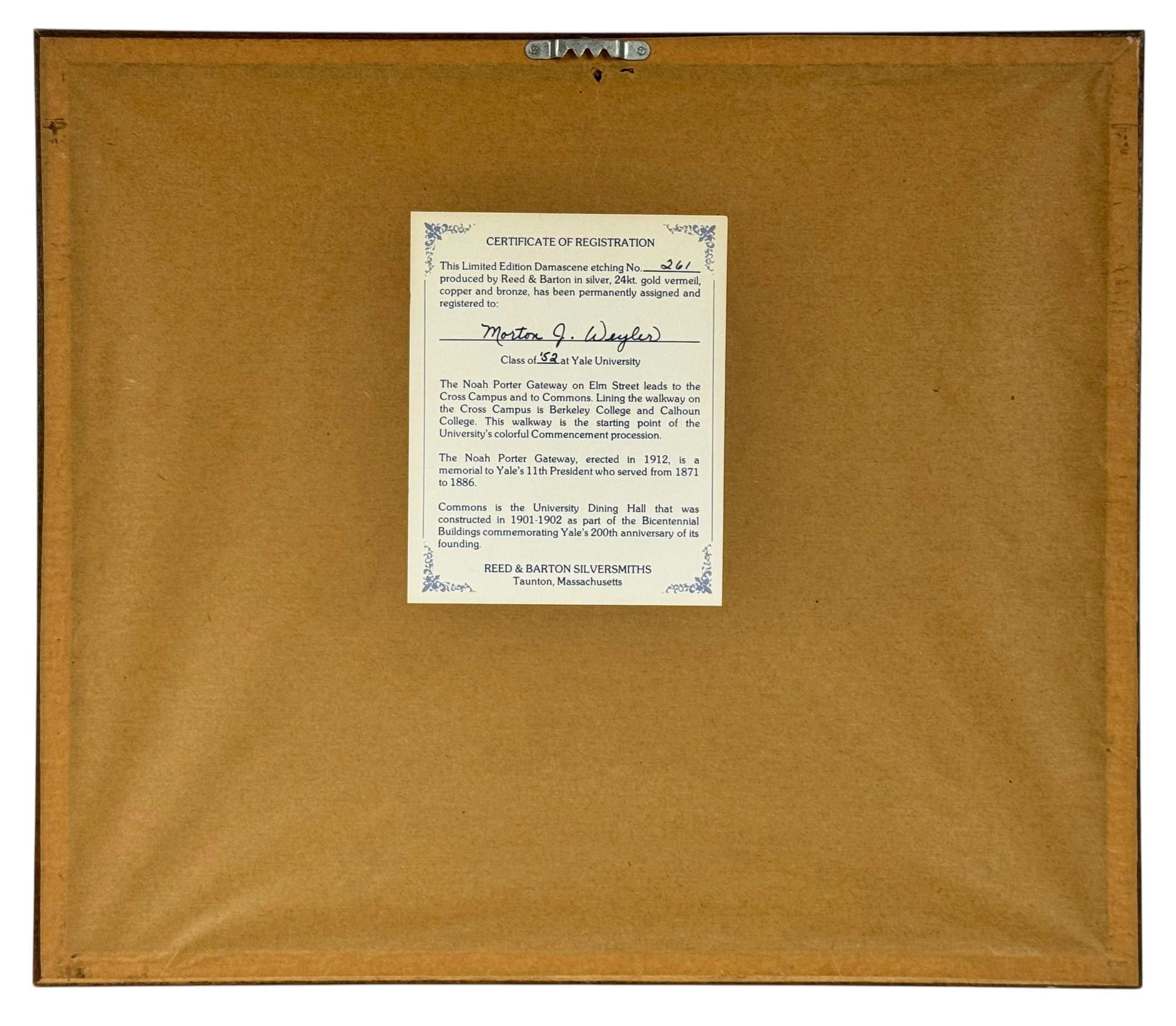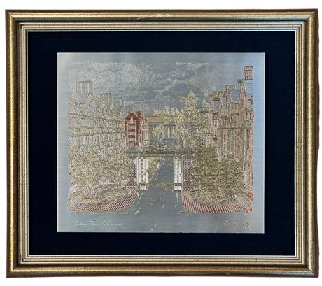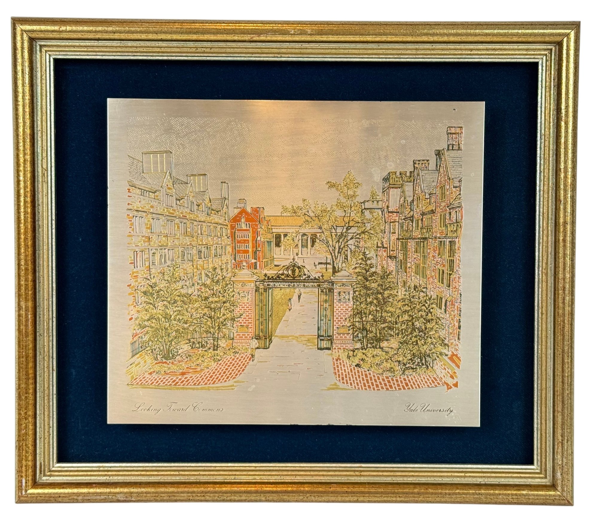 Limited Edition Damascene produced by Reed & Barton in silver, 24kt. gold vermeil, copper and bronze, "Looking Toward Commons" certificate of Registration number 261, of the Noah Porter Gateway on Elm St.