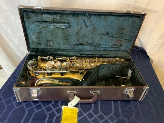 This in a Yamaha alto saxophone model YAS-23, serial number 085402. This instrument looks complete with neck strap and mouthpiece and has original case. The instrument has some damage to the finish and will likely need servicing but it is believed to be playable. Case looks to be in good condition but needs cleaning and airing out. This sax is a very high quality instrument and well worth servicing to extend its life. We found these online in similar condition for $200 and more!