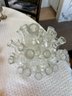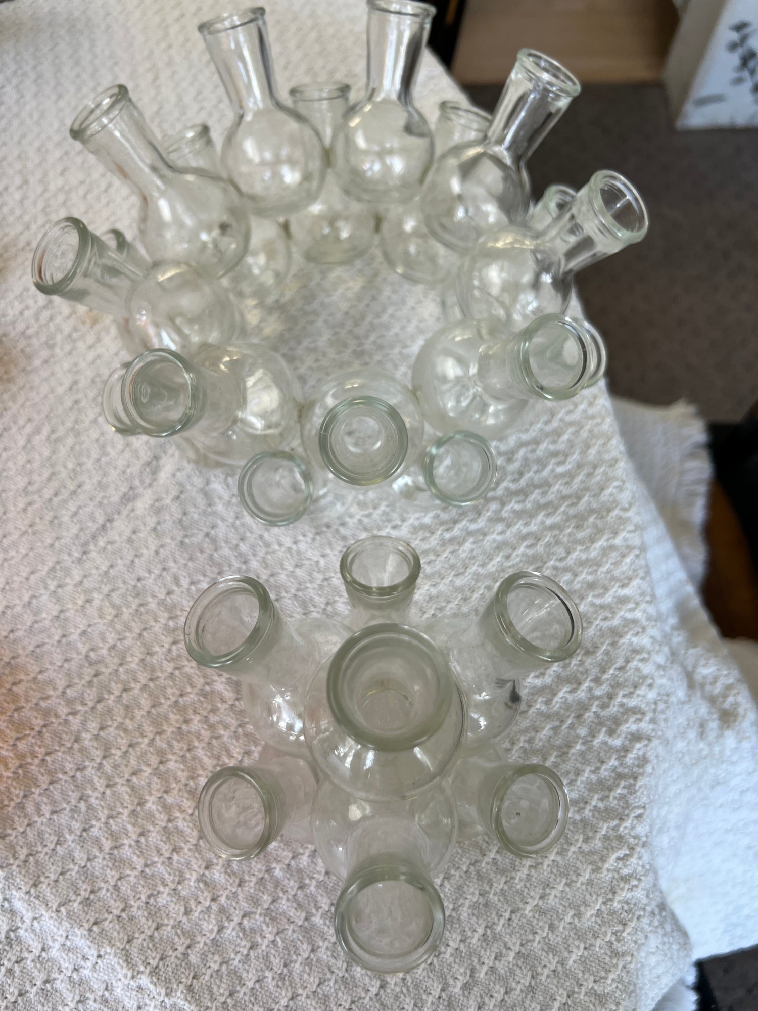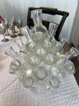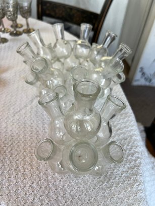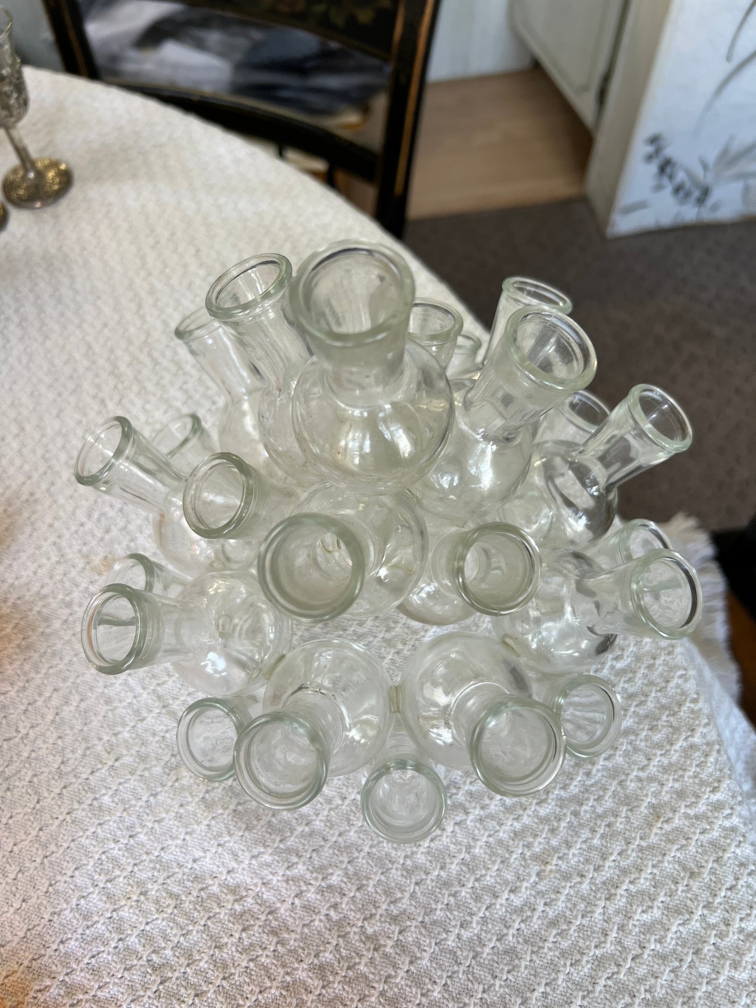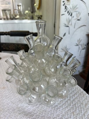 Unique and stylish two-piece pyramid of twenty-five fused individual tiny colorless glass bud vases to produce a captivating flower frog.