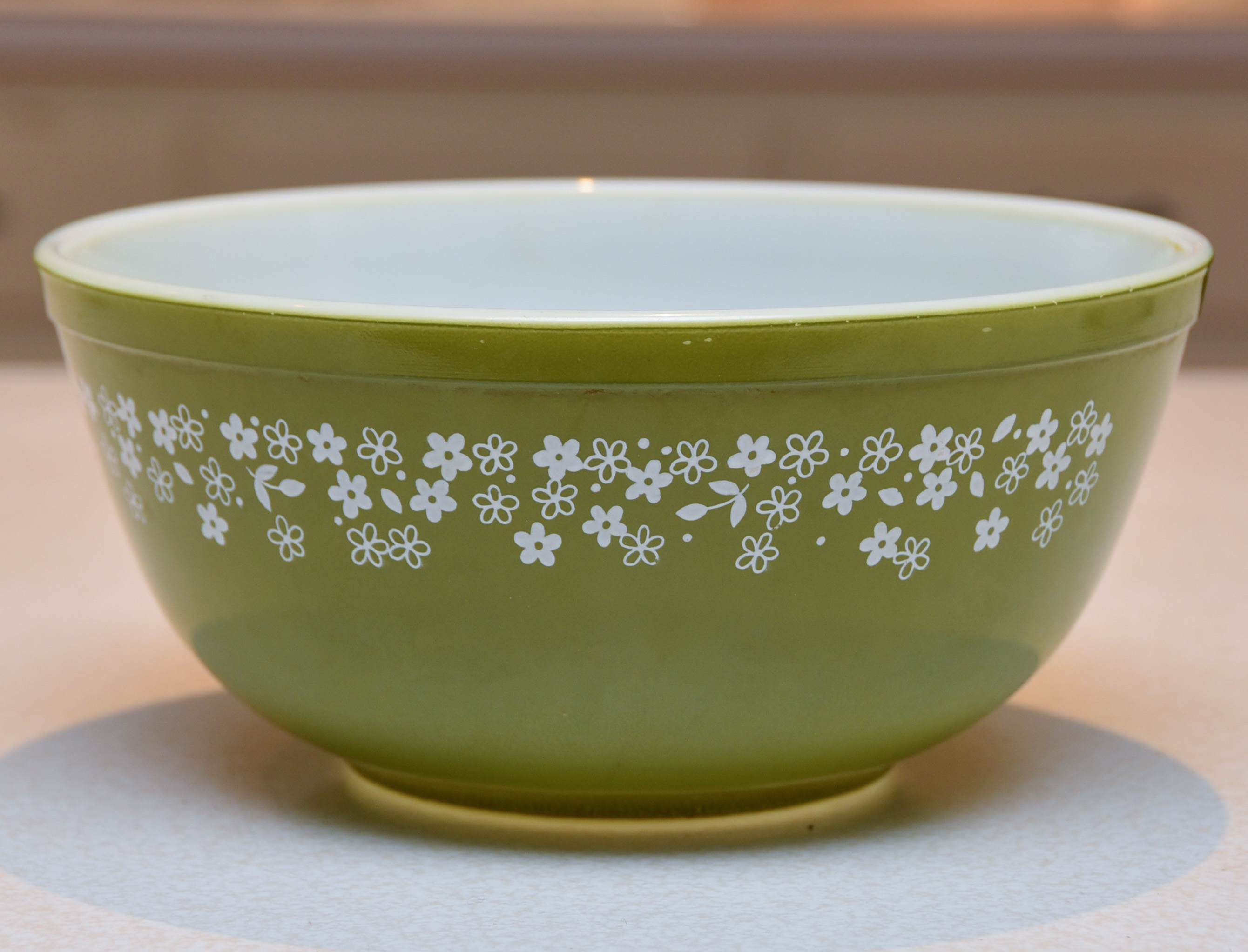 #403, 2 1/2” qt. This is version two of Spring Blossom issued in 1979 and after the demise of the original version (1972-1979). The revised pattern features smaller and more plentiful flowers with a smattering of solid white leaves.