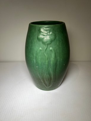 Zanesville green glazed vintage Ohio pottery vase with a flower motif.