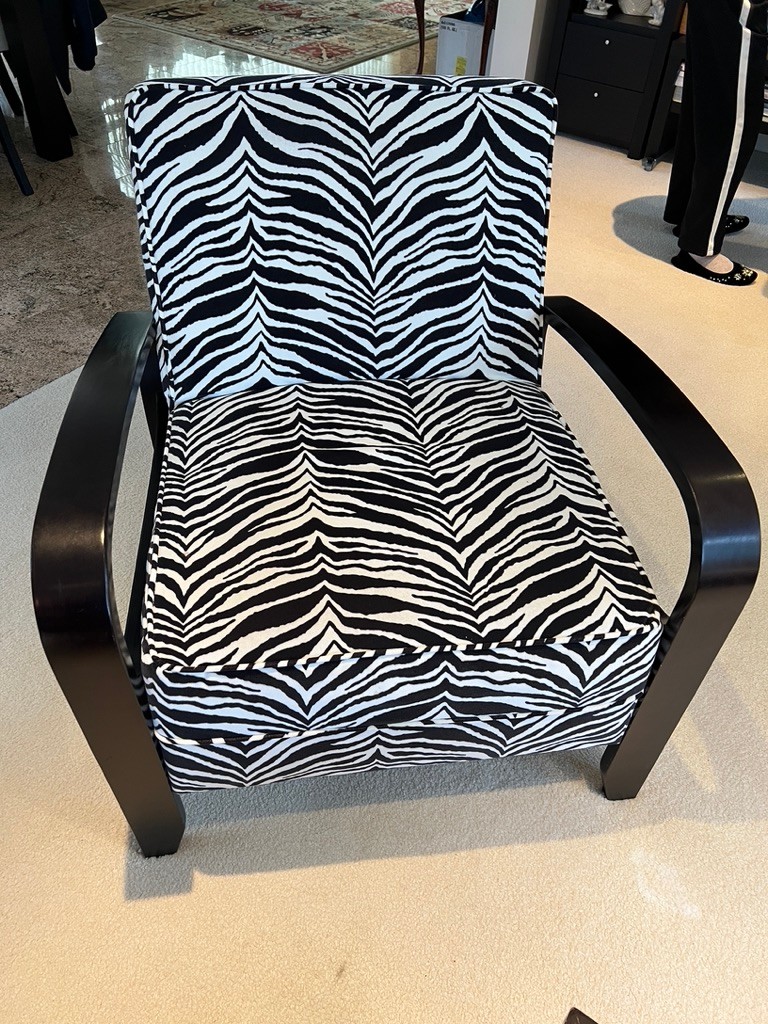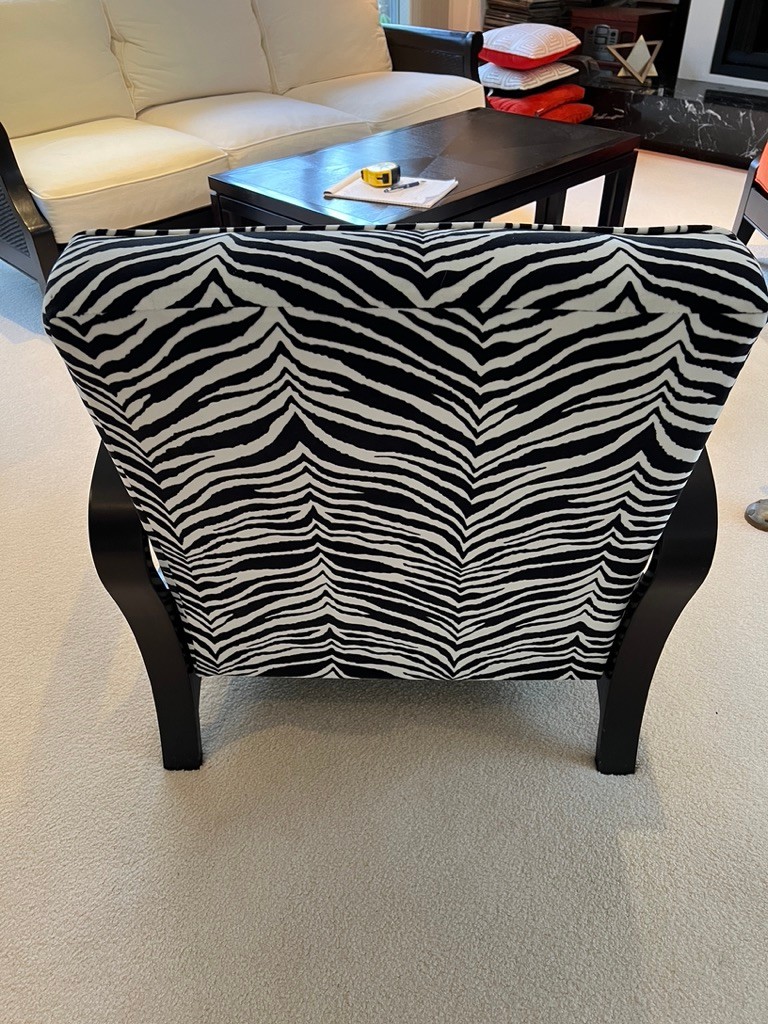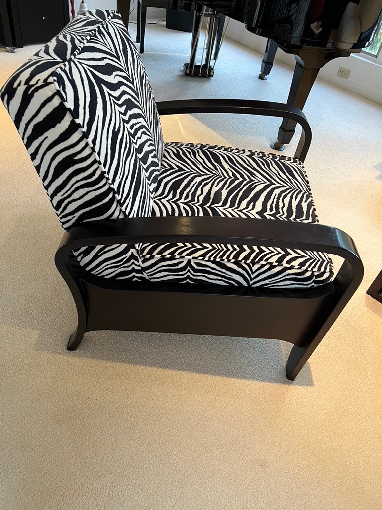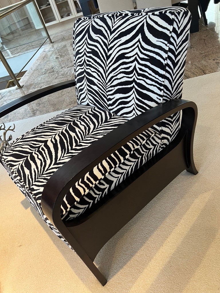 Zebra striped side chair, with arms, in super condition, walnut frame, black and white in color, stunning condition,