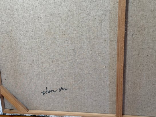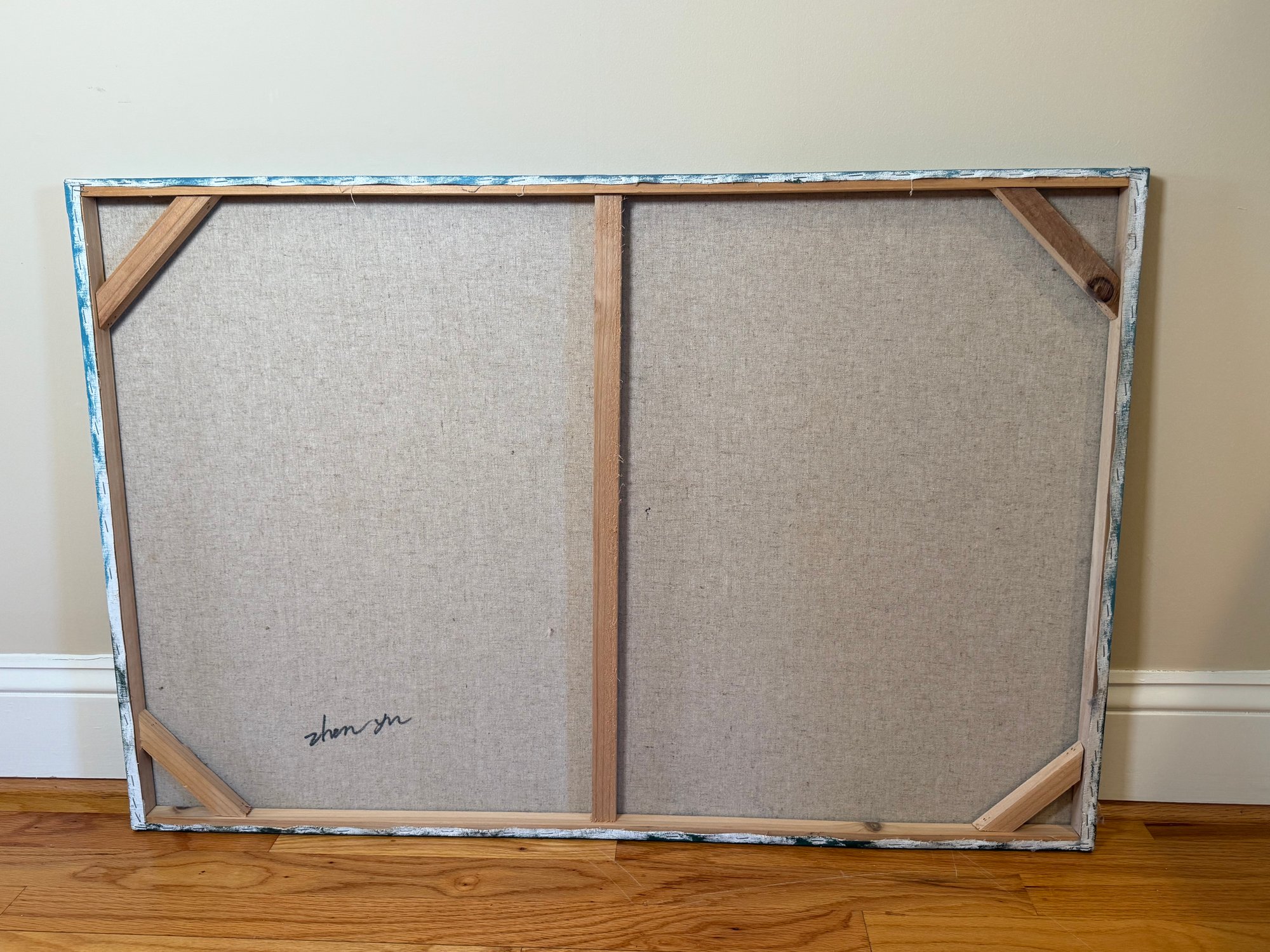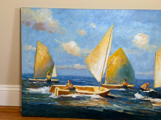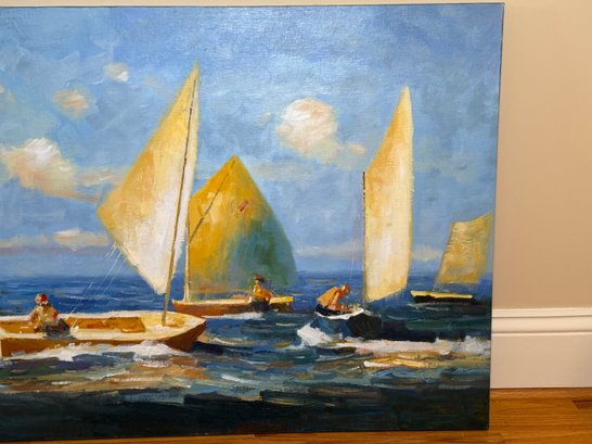 This amazing painting depicts several small sailboats with sails racing on a choppy sea. Purchased at a fine art market in Hong Kong. Signed on the backside.