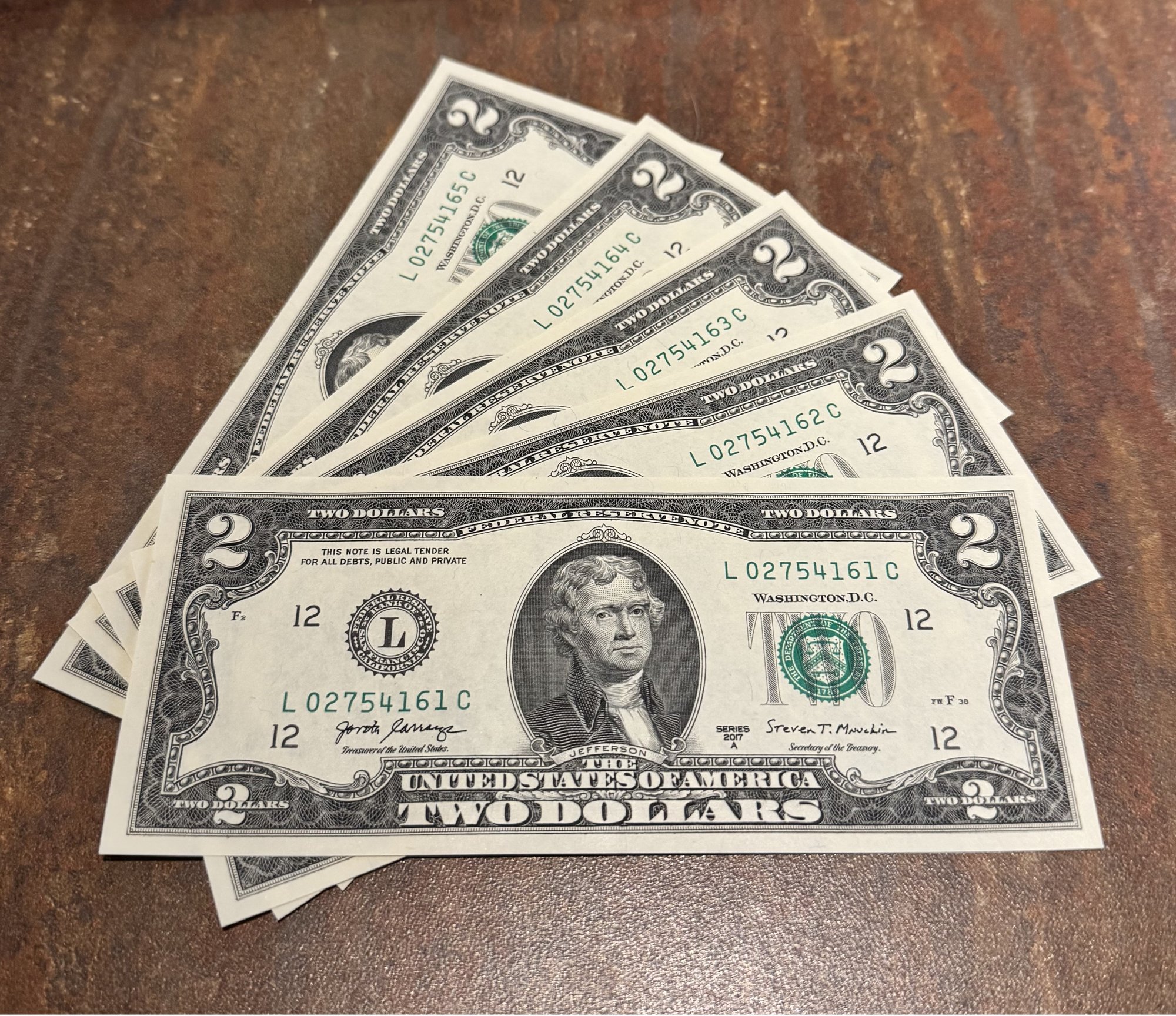 (5) 2017-A $2 Bills - Uncirculated & Consecutive
