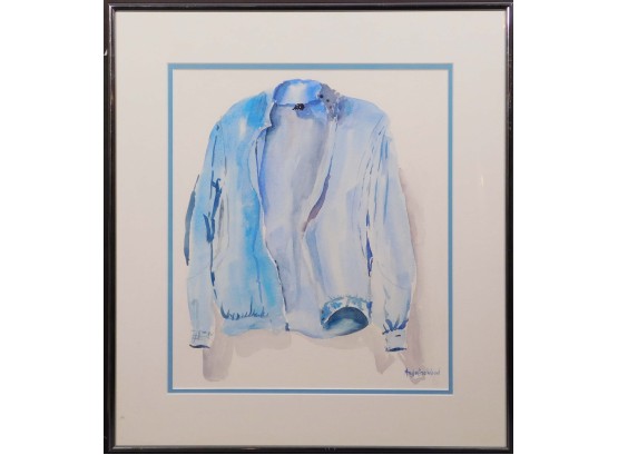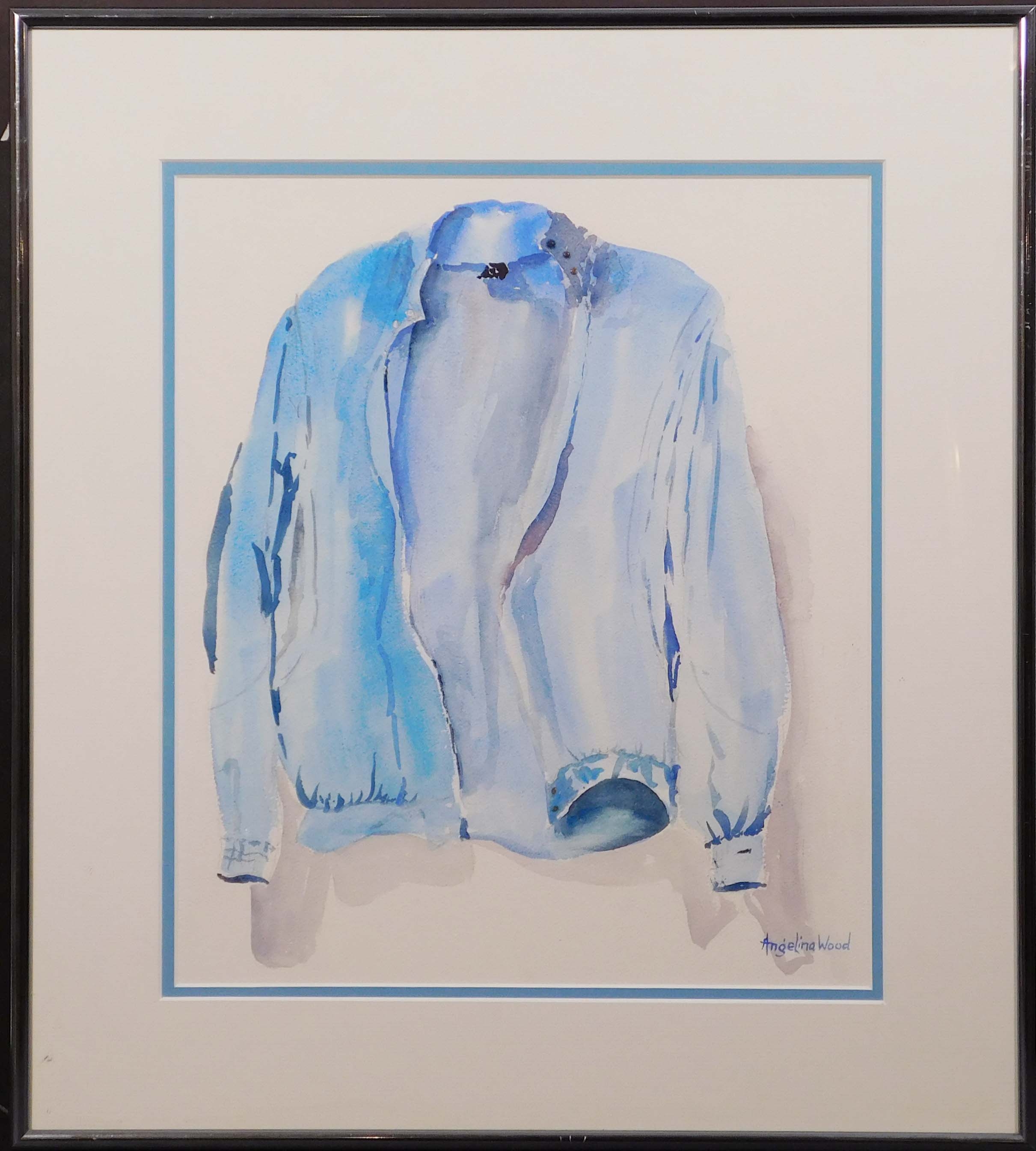 Angelina Wood (American, 1930-2003): Blue Jacket. Watercolor on cold pressed paper, professionally framed. Angelina was a well known regional artist in Southern Massachusetts, where she operated an art gallery and art school. Many of her young students went on to attend art colleges, and some of her adult students eventually opened their own galleries in coastal towns. She was a member of the Rhode Island Watercolor Society, where she was recipient of many accolades , including the Grumbacher Award. Along with her son Bruce co-founded AFA Press, an art printer and publisher in Michigan. Her art was sold nationally by that company. Angelina Wood's paintings are in collections including the Franklin Public Library, Boston Children's Hospital, and numerous other health care facilities. She believed that her are should evoke positive feelings in viewers, and during her lifetime her work was valued for that quality. 20 x 17.5 inches framed.Private Collection Boston