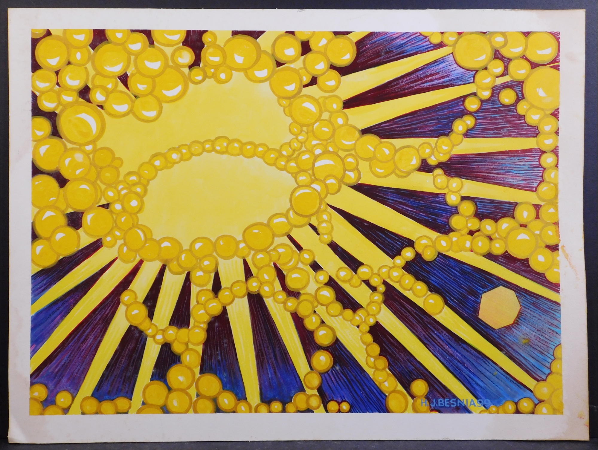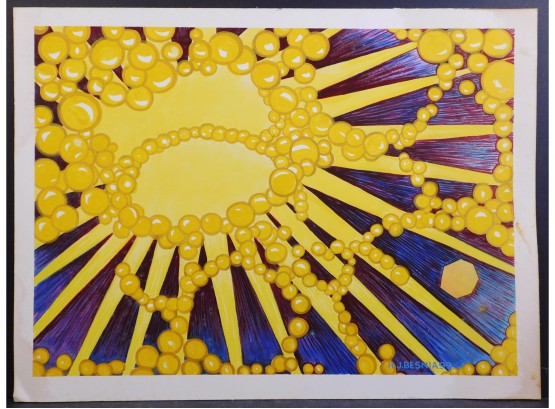 Howard Besnia (American, 1921-2014): Cosmic Painting, 1999. Tempera on illustration board, signed and dated below, unframed. Howard Besnia was a prolific painter and printsman known for his eclectic oeuvre and his handmade books. Beginning as a cartographer for the United States Army in 1944, he soon became the staff artist for many USO clubs, producing caricatures and portraits of the troops. After subsequent training at the Corcoran School of Art, Clark University and Yale University, Besnia went on to head the art department at Fitchburg State University for decades.18 x 24 inches.From the artist's estate.