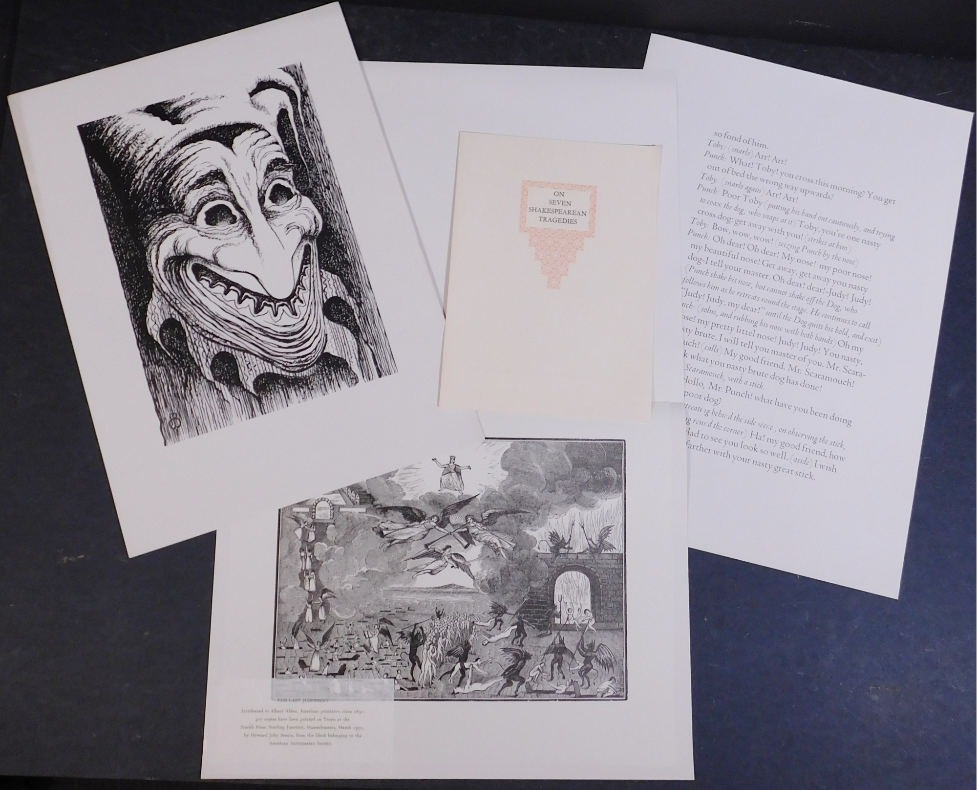 Howard Besnia (American, 1921-2014): Several Lithographs and Wood Engraving prints on various types of paper. Printed at Scarab Press in the 1970's. Howard Besnia was a prolific painter and printsman known for his eclectic oeuvre and his handmade books. Beginning as a cartographer for the United States Army in 1944, he soon became the staff artist for many USO clubs, producing caricatures and portraits of the troops. After subsequent training at the Corcoran School of Art, Clark University and Yale University, Besnia went on to head the art department at Fitchburg State University for decades.Approx. 18 x 13 inches.From the artist's estate.
