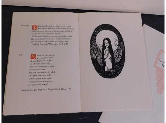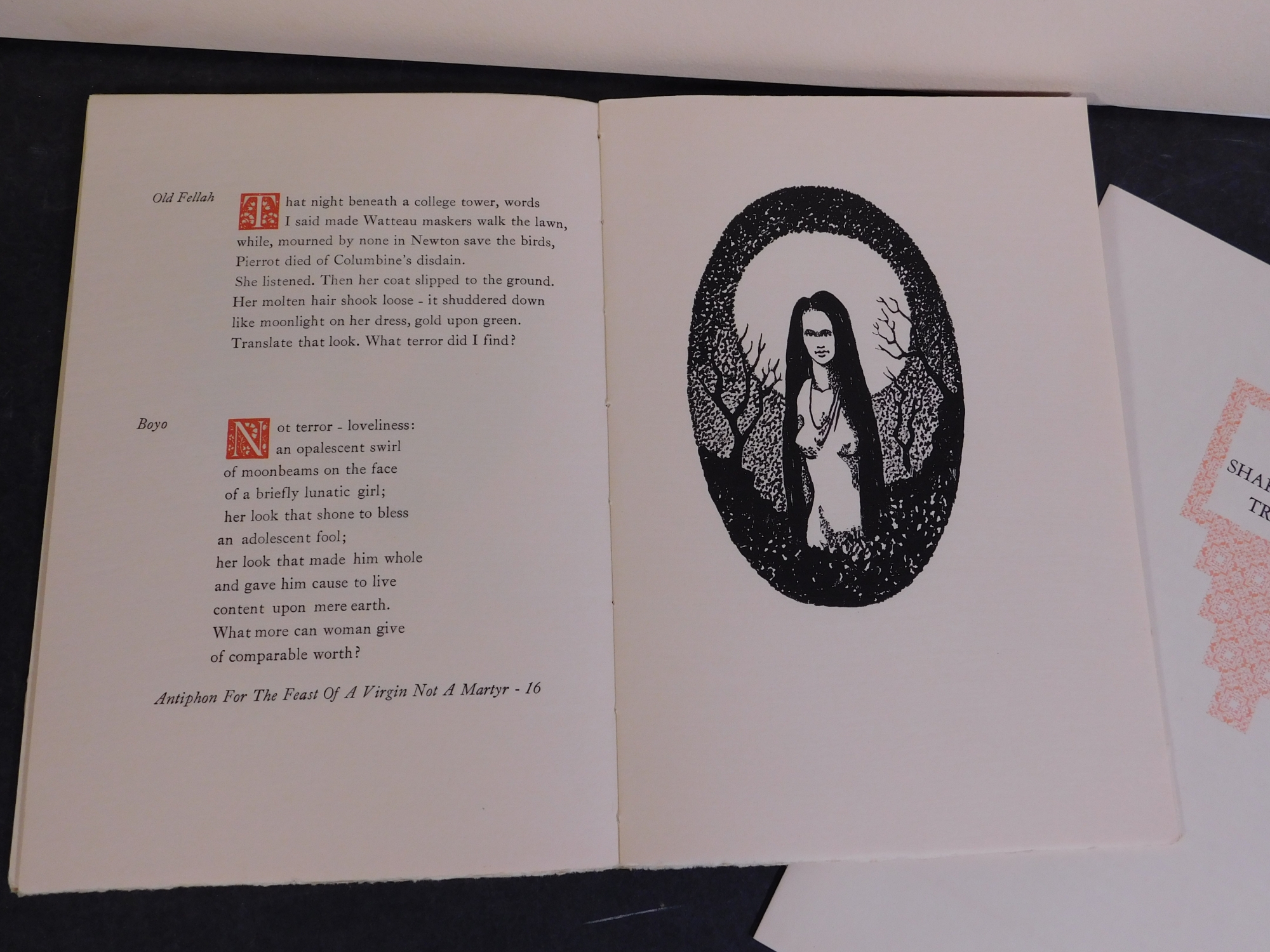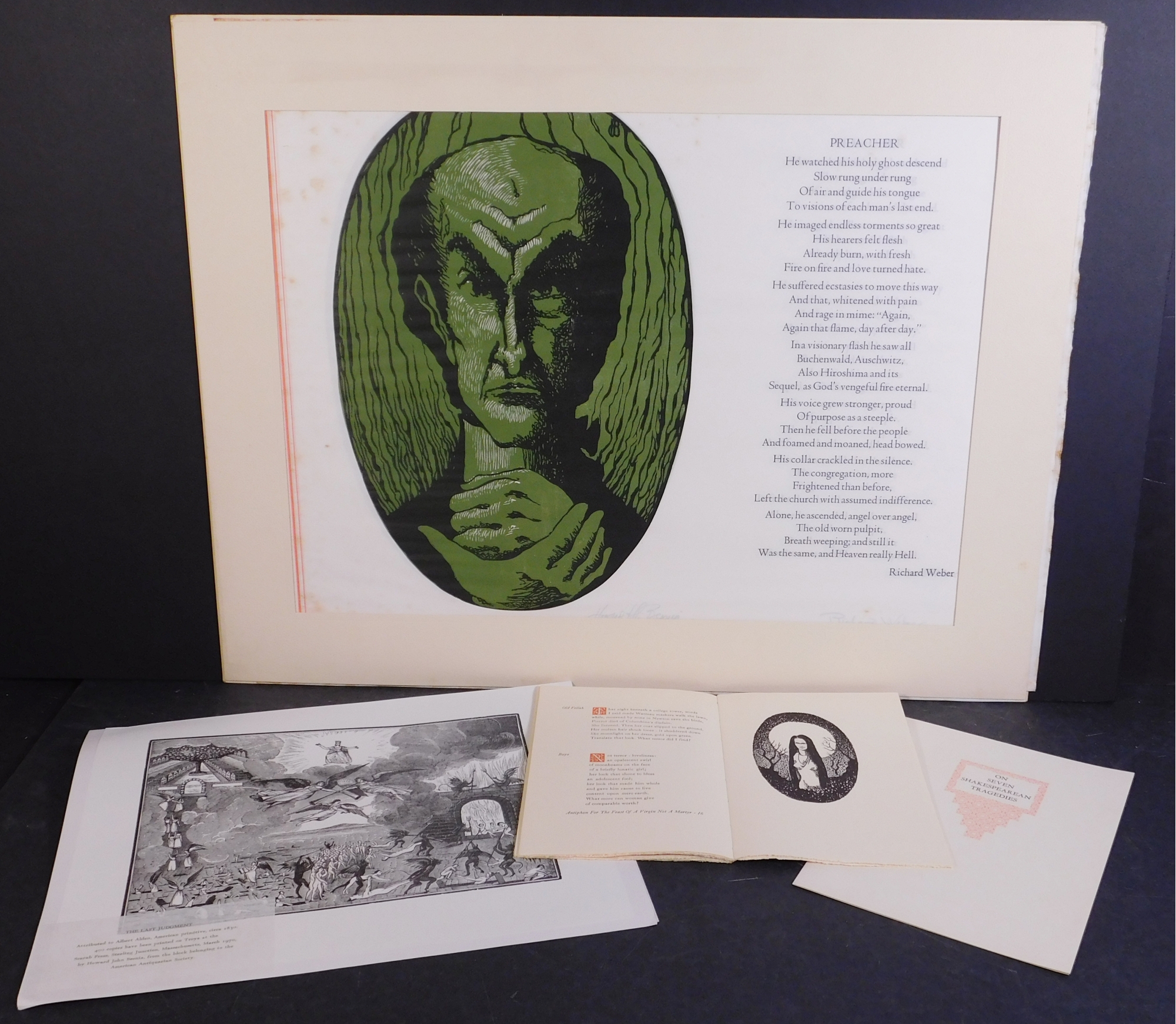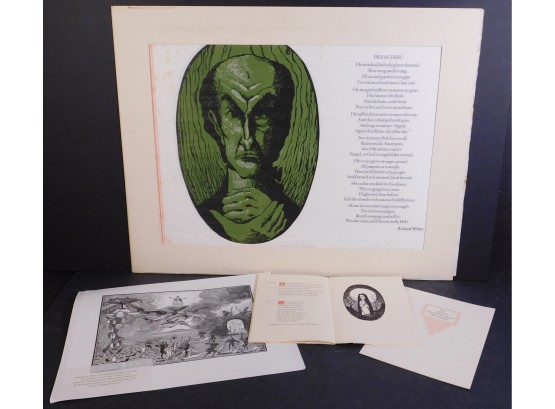 Howard Besnia (American, 1921-2014): Several Lithographs and Wood Engraving prints on various types of paper. Printed at Scarab Press in the 1970's. Howard Besnia was a prolific painter and printsman known for his eclectic oeuvre and his handmade books. Beginning as a cartographer for the United States Army in 1944, he soon became the staff artist for many USO clubs, producing caricatures and portraits of the troops. After subsequent training at the Corcoran School of Art, Clark University and Yale University, Besnia went on to head the art department at Fitchburg State University for decades.Approx. 22 x 28 inchesFrom the artist's estate.