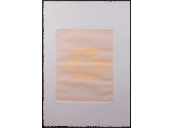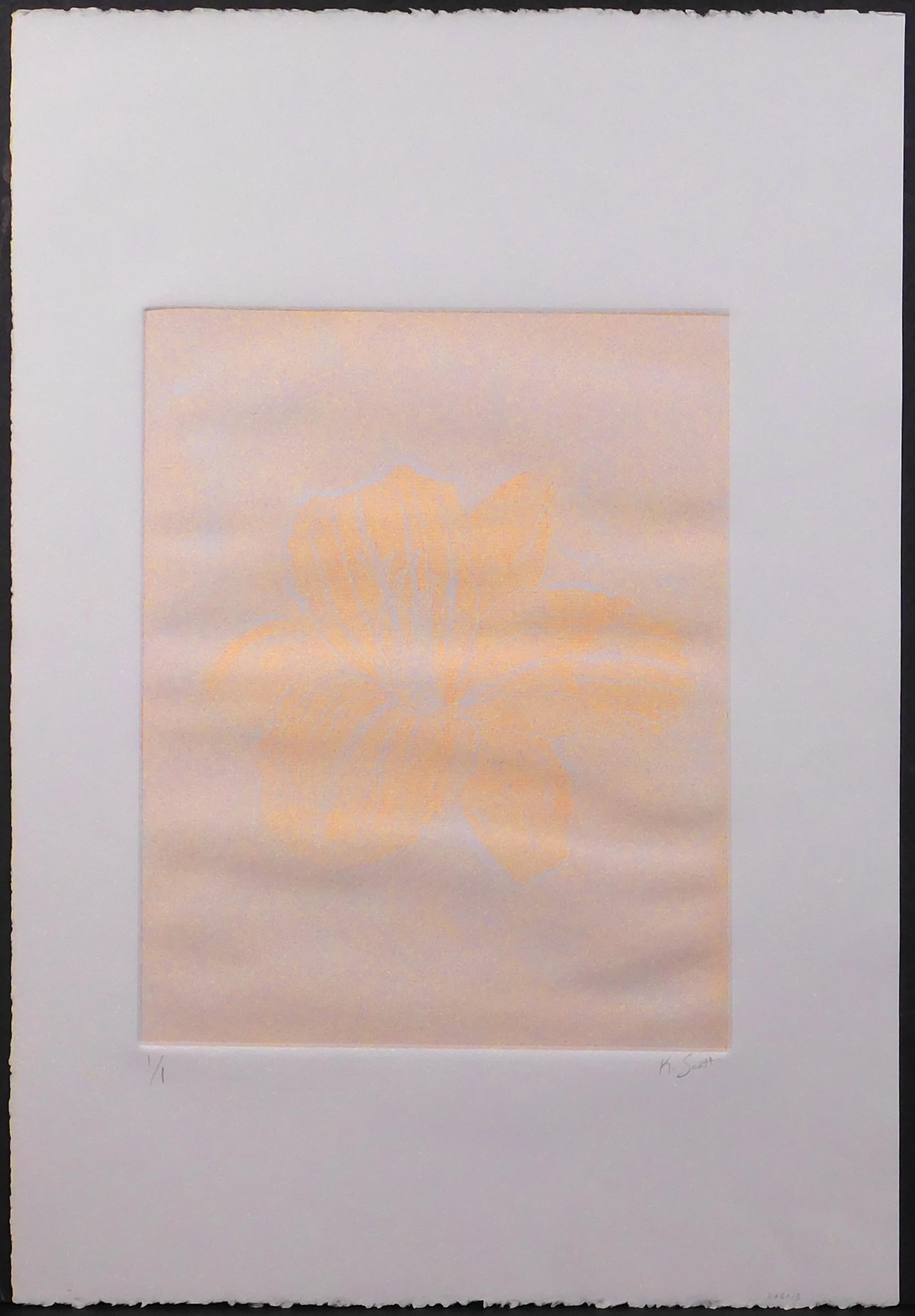 K. Scott (American, 20th Century): Lilly. Monotype on heavy rag paper, signed and numbered (1/1) in pencil. Inventory number in pencil on the edge. Unframed. The monotype is actually a very simple medium that only requires applying pigments or ink to the smooth substrate plate. The plate for a monotype is a blank smooth surface that has no permanent markings or incisions. Picture a painting on a piece of smooth acrylic. This image on the smooth surface is created by applying the ink. It can be brushed, rolled, daubed or applied in any way that suits the artist. The artist may further manipulate the ink before a sheet of paper is applied on top of the image. This plate with the paper applied on top is then run through the press. What is created is a unique one-of-a-kind work on paper.So here's the question we are frequently asked at this point in the explanation: why doesn't the artist avoid all this rigamarole involving the plate and press and just paint directly on the paper?Simply put, our answer is that the monotype can have remarkable transparency combined with a layered quality that one is unlikely to get from a painting on paper. Also many of the monotype artists we work with have told us they enjoy the element of surprise that comes with lifting the paper off the plate after it has gone through the press. One is never quite sure what the print will look like. Sometimes they can, of course, be disappointed but, as one of our artists elegantly puts it, there can also be some "happy accidents".22.5 x 15 inches paper; 13 x 10 inches plate.Private collection, Boston.