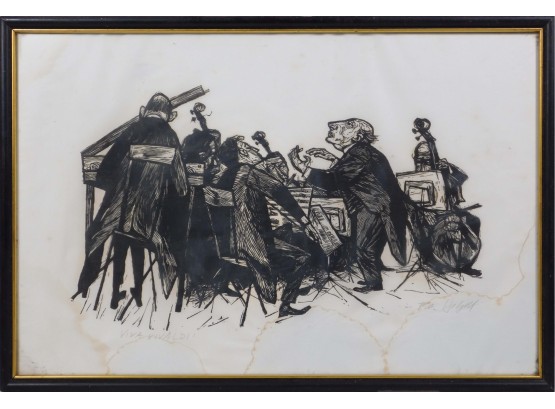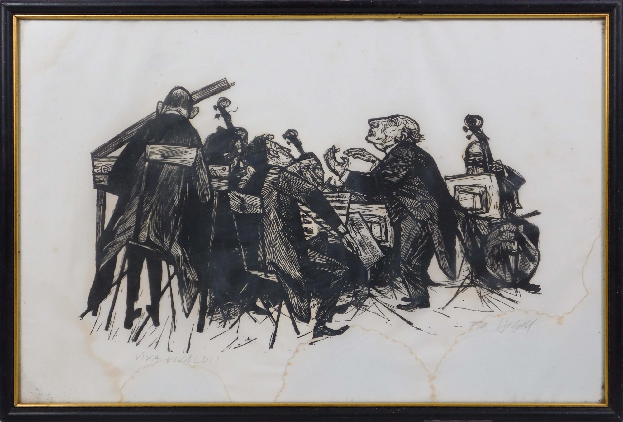 Robert O. Hodgell (American, 1922-2000):Viva Vivaldi. Linocut print on paper, signed and titled below, framed. Robert Overman Hodgell (1922�2000), son of a Methodist pastor in Makato, Kansas, was a prominent printmaker and educator. He studied under Alfred Sessler at the University of Wisconsin�Madison and apprenticed with American Regionalist painter John Steuart Curry on the Kansas State Capitol murals. After serving in the U.S. Navy during World War II, Hodgell taught at institutions including Des Moines Art Center, University of Illinois, Florida Presbyterian (Eckerd) College, Ringling School of Art, and University of South Florida. Known for his linoleum and woodcut prints, Hodgell's work is held in collections like the Library of Congress and Ringling Museum of Art. He also illustrated various publications, including works found in the Bridwell Library collections.16 x 24 inches framed.Private Collection Boston