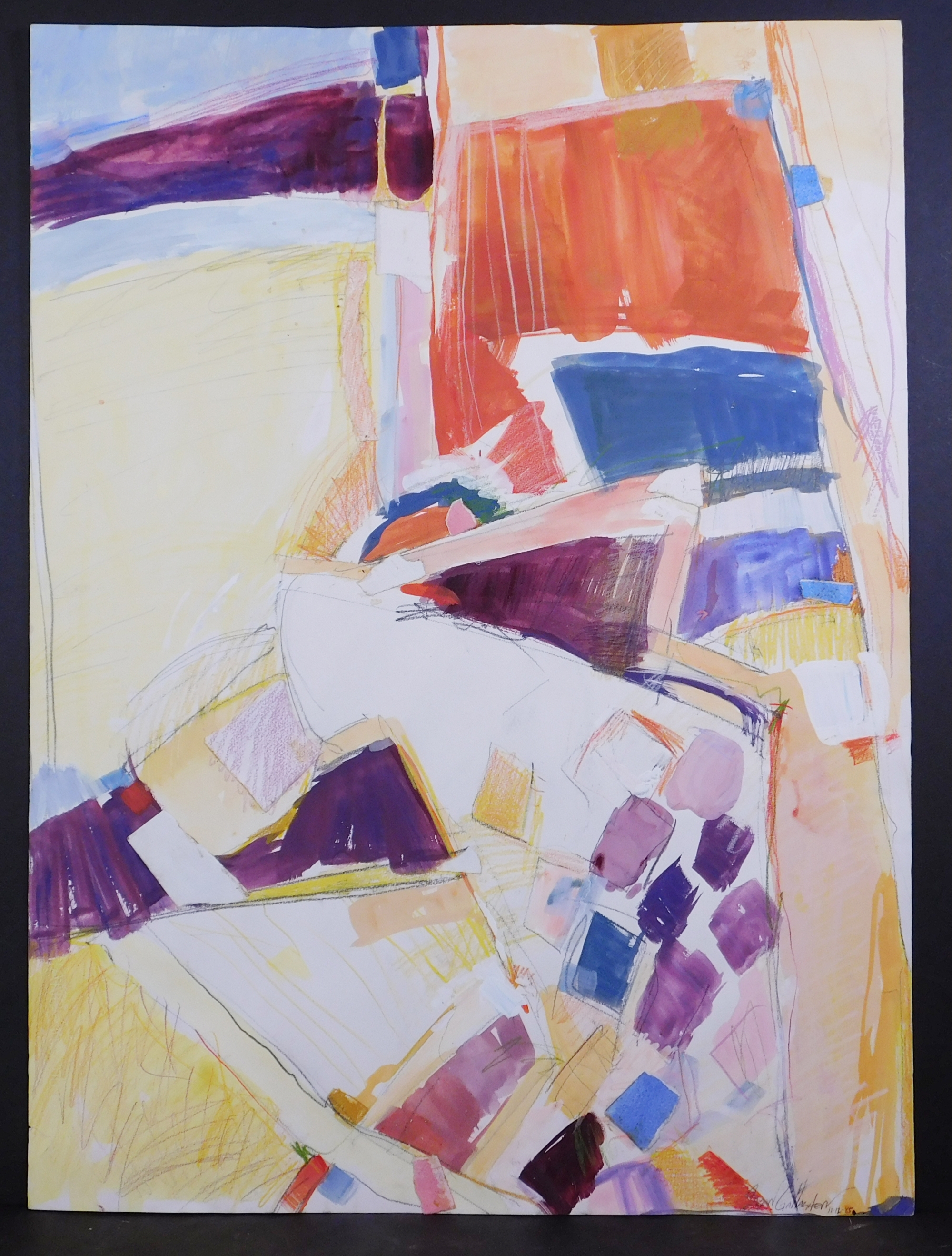 Susan Gallagher (20th c. American): Abstract Composition with Collage, 1985. Gouache and oil stick on paper, signed and dated below. 29.5 x 22 inches paper.Private collection, New England, USA.
