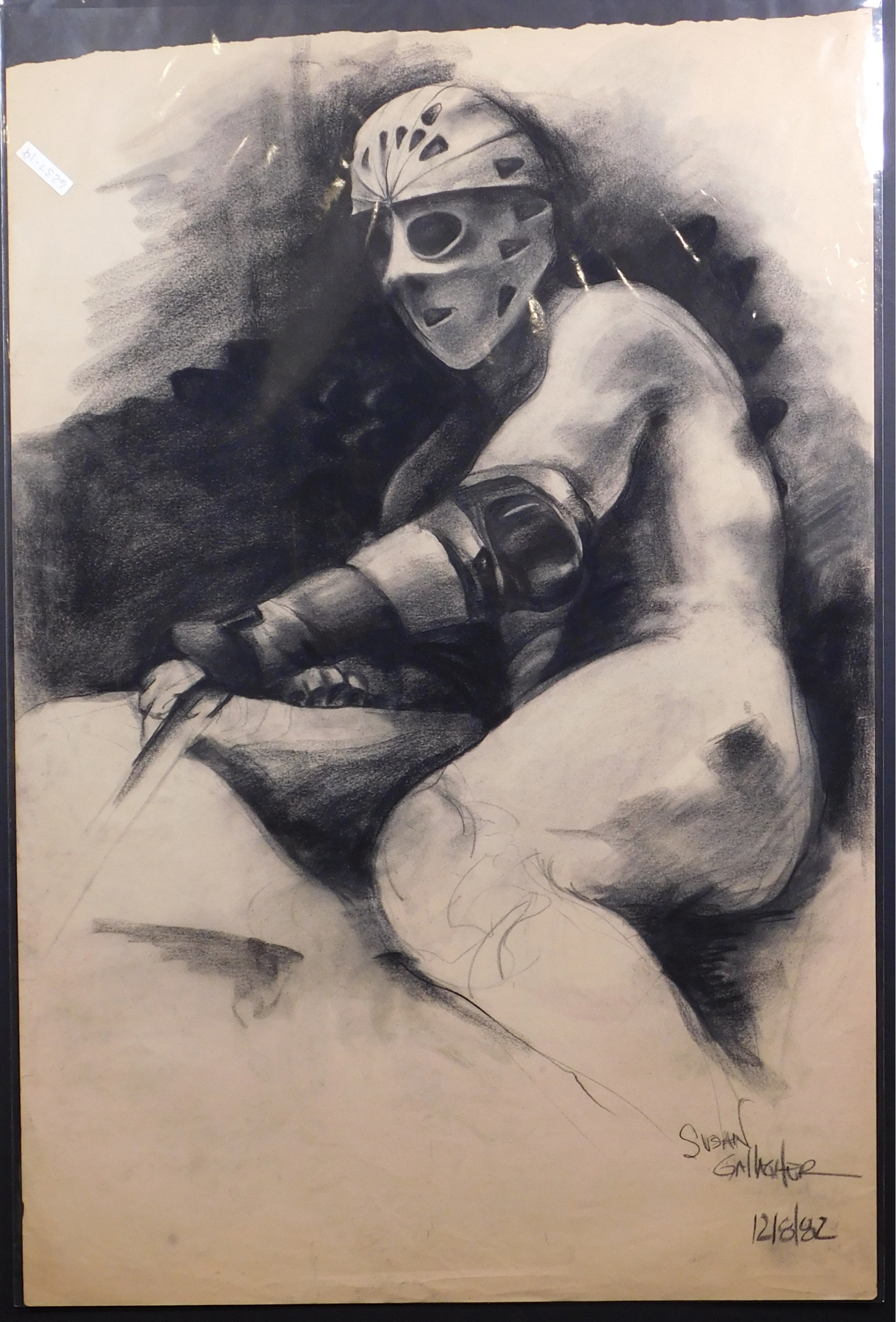 Susan Gallagher (20th c. American): Large Fantasy Figure Study, 1985. Charcoal on Sketch Paper. Signed and dated below.36 x 24 inches paper.Private collection, New England, USA.