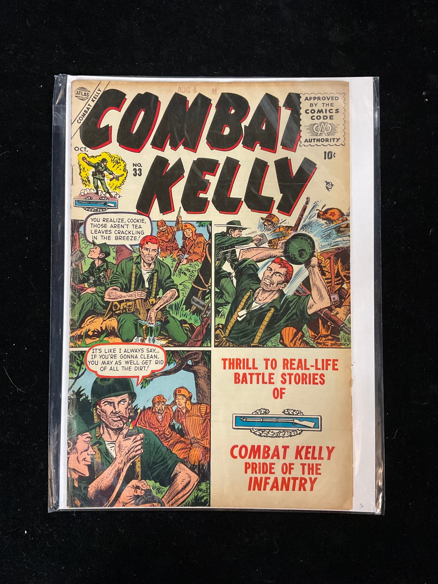 Story Summary: The main story, "Get Into The Thick Of Battle With... Combat Kelly!", follows American Air Force pilots Ted Holden and Mike Higgins as they are shot down over the Pacific, only to discover a remnant of the Imperial Japanese Army still fighting on a remote island ten years after World War II had ended