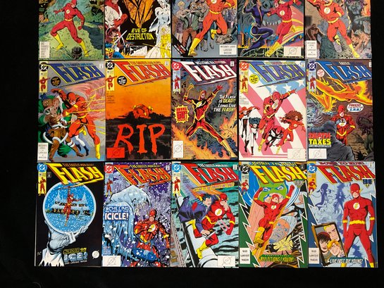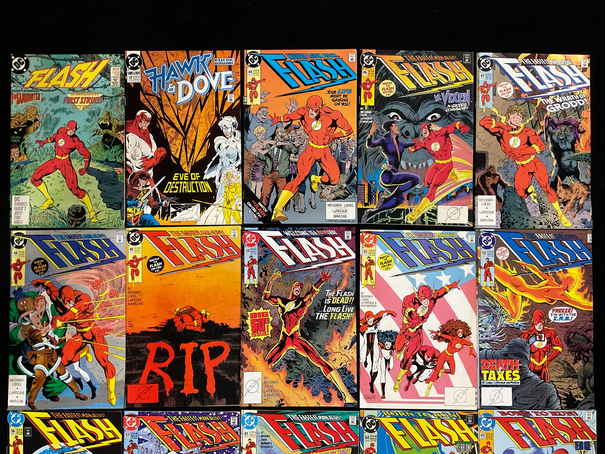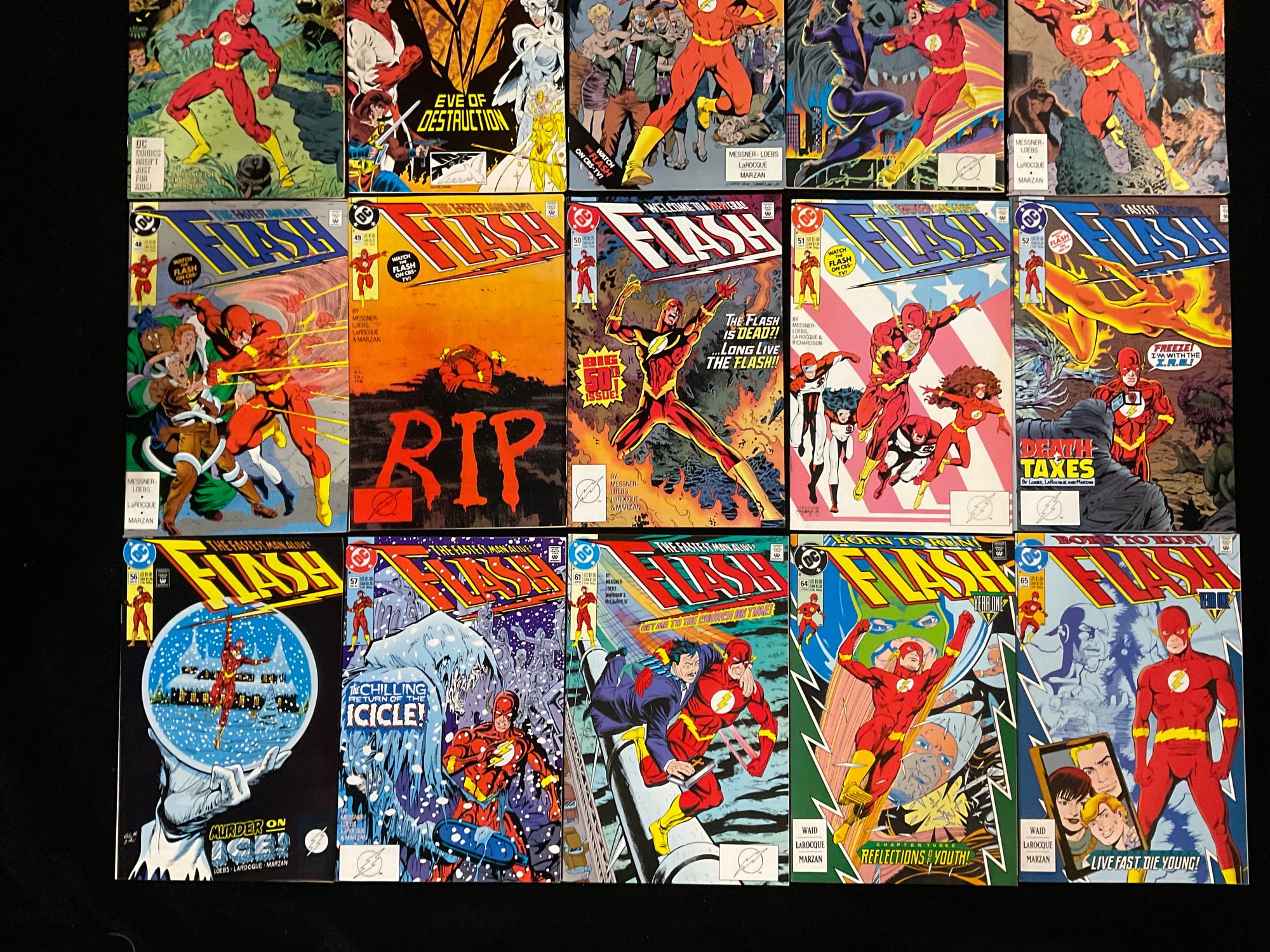 The Flash #44 (1990): This issue, written by William Messner-Loebs with art by Greg LaRocque, features a cover depicting Flash surrounded by a crowd with the tagline "Your life might be gaining on you!".