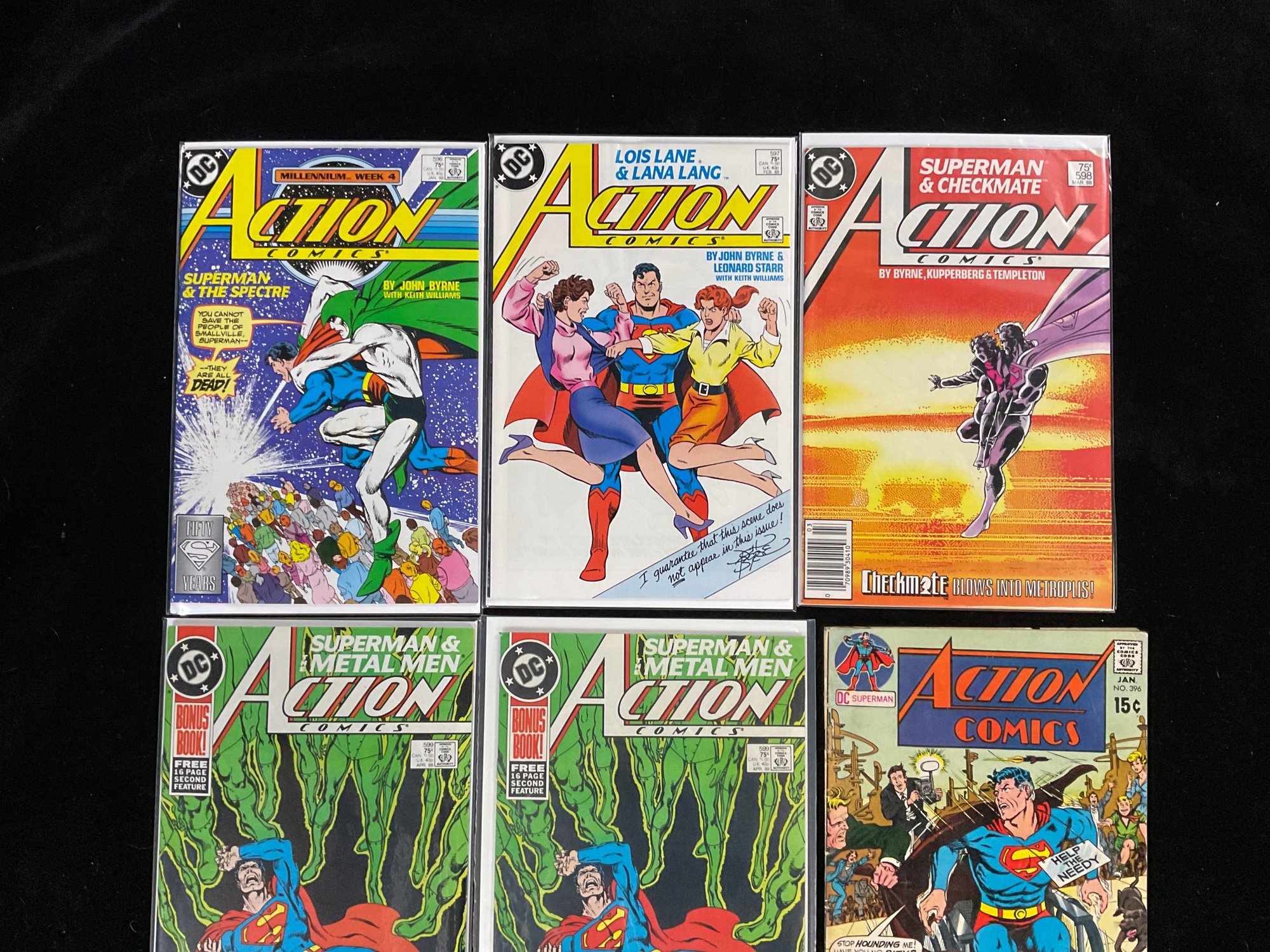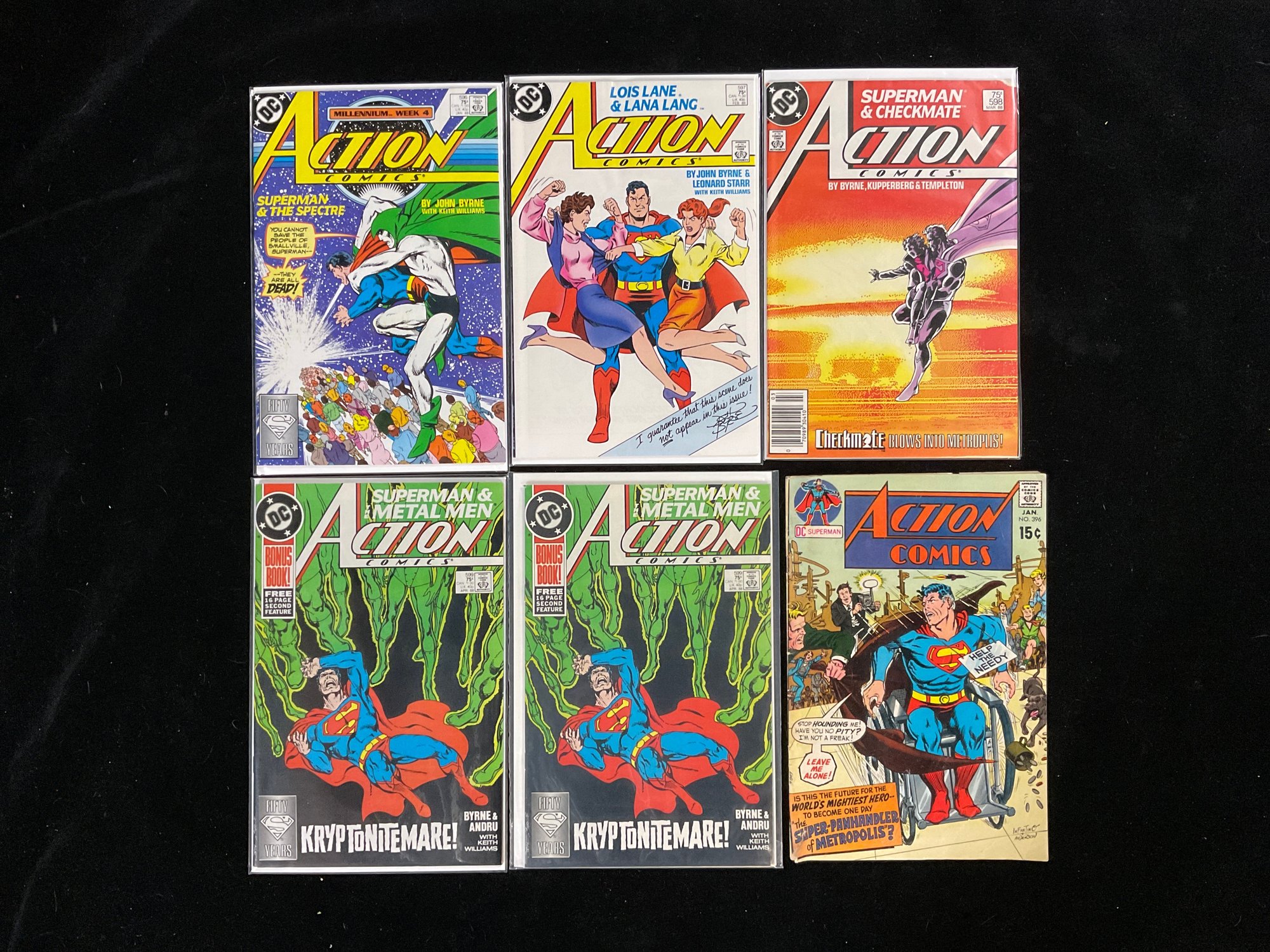 Top Left: Action Comics #596 (January 1988), titled "Superman & The Spectre". It is part of the Millennium crossover event (Week 4) and features cover art by John Byrne.