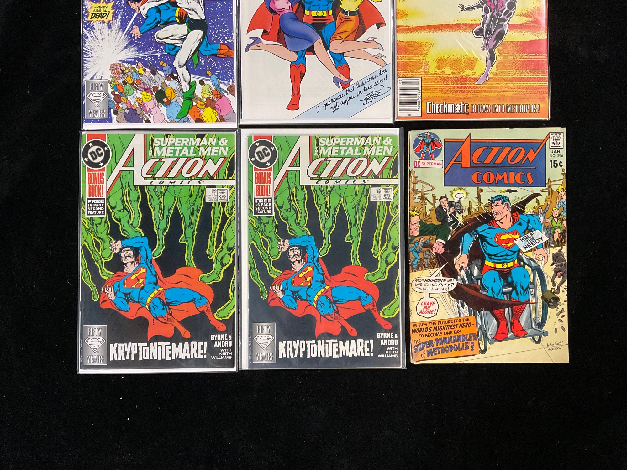 Bottom Left & Center: Two copies of Action Comics #599 (April 1988), featuring "Superman & Metal Men". The cover story is titled "Kryptonitemare!" and features the origin/single appearance of the Kryptonoid Man.