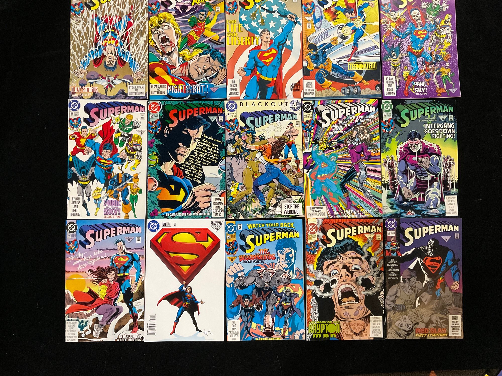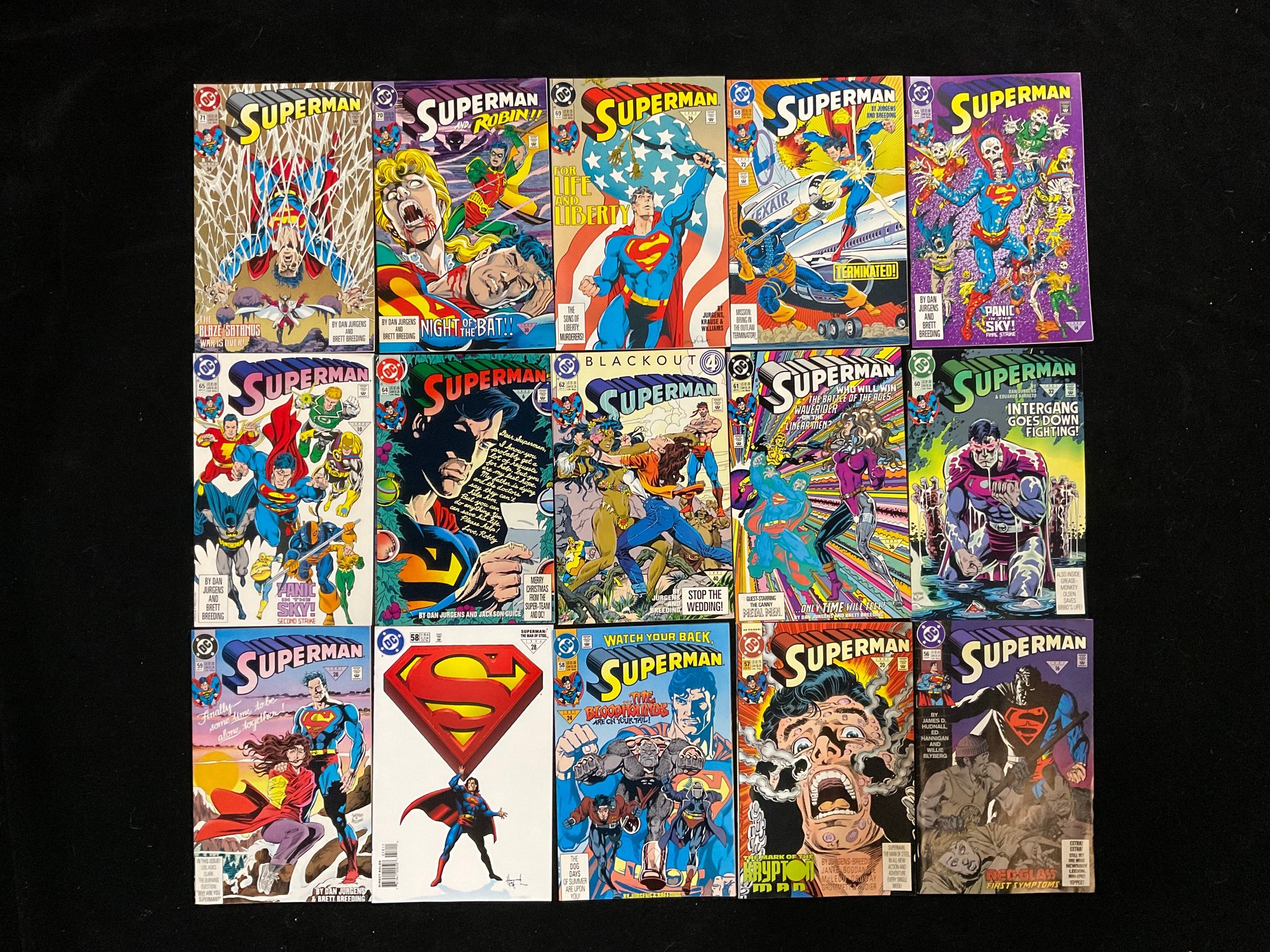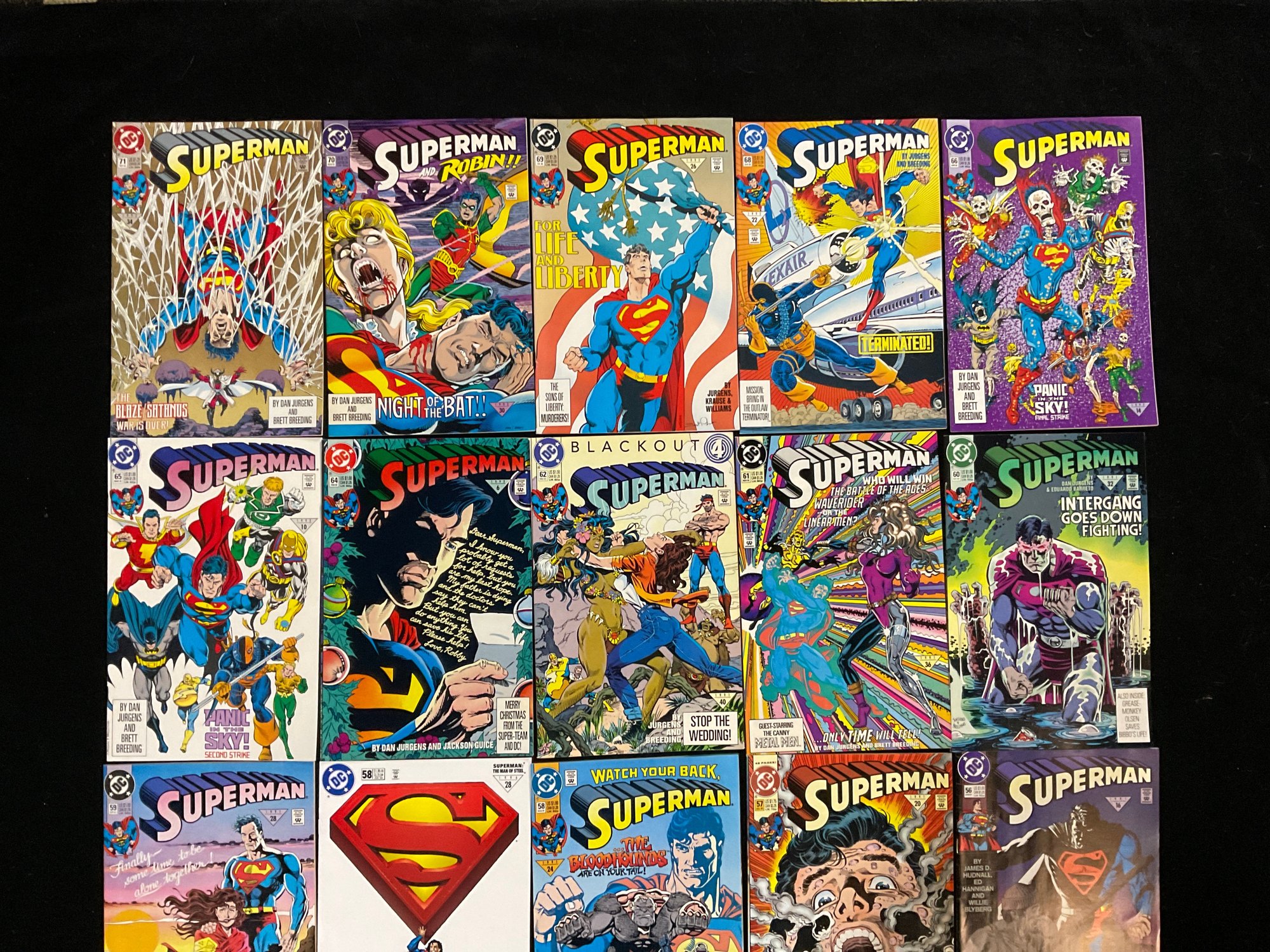 Superman (Unidentified Issue): Likely another issue from the early 90s era, possibly #56 or an adjacent number, featuring Superman in a dark, atmospheric setting
