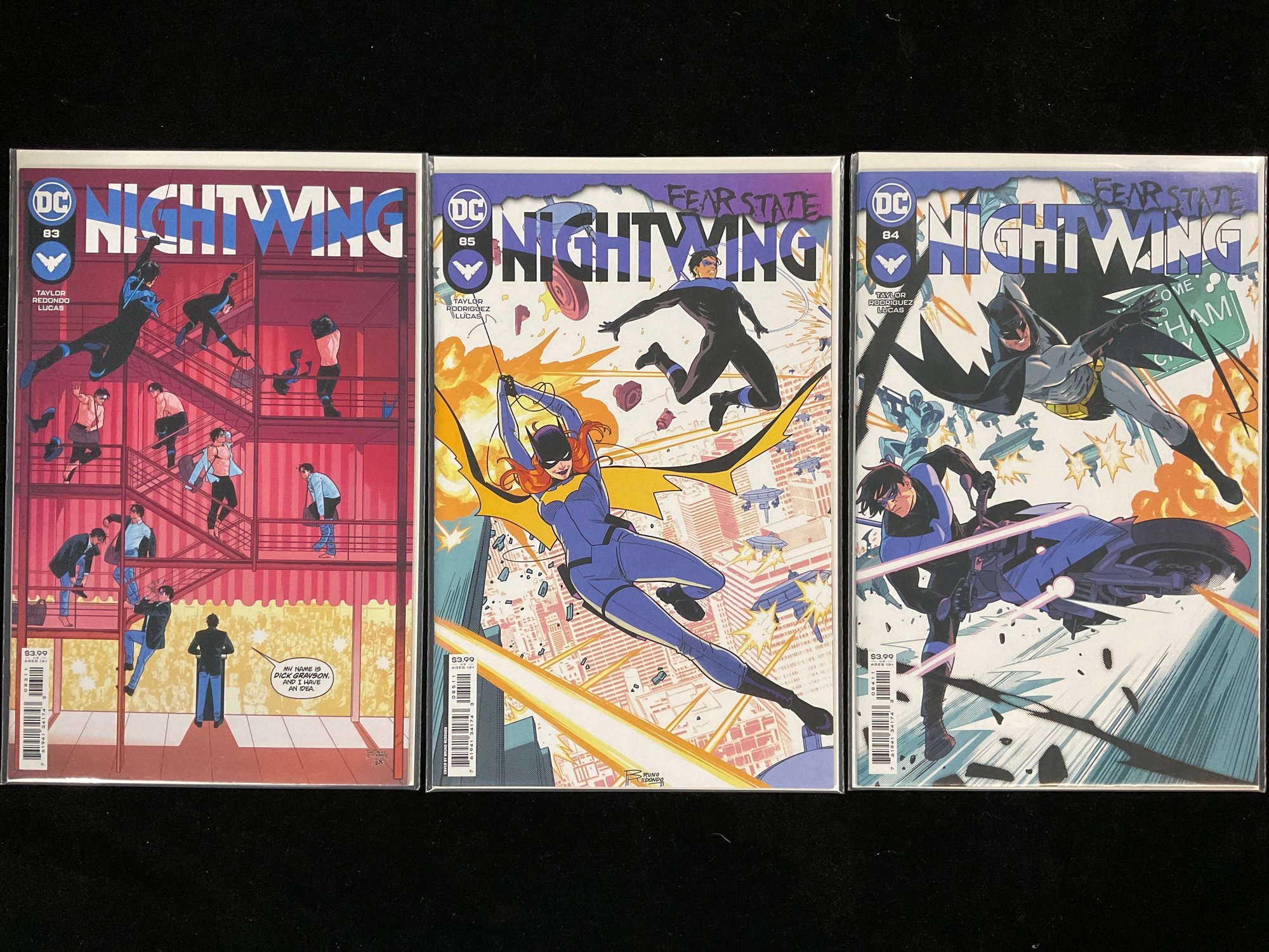 Nightwing #85 (Middle): A Fear State tie-in where Barbara Gordon (Babs) suits up as Batgirl to track down an "Anti-Oracle" attacking her network. This issue features art by Robbi Rodriguez and a cover by Bruno Redondo.