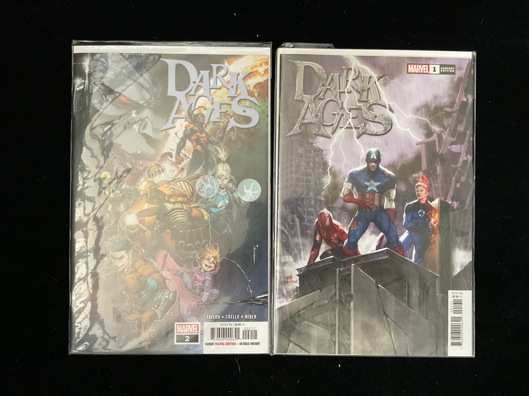 Dark Ages #2: The comic on the right features the main cover art by Iban Coello. This issue picks up seven years after the blackout, showing how the world has regressed to a "dark age" where heroes like the Avengers and X-Men must work together to build a new society in the darkness while facing threats like vampires and the rise of Apocalypse