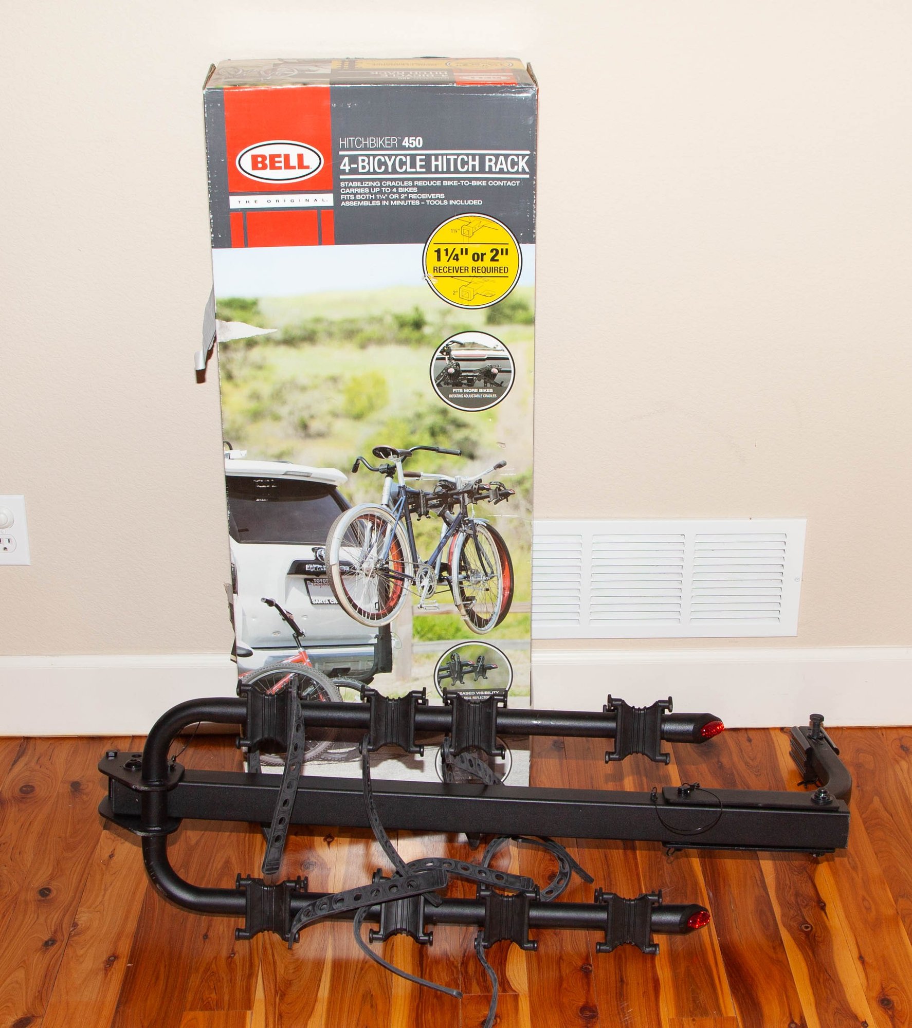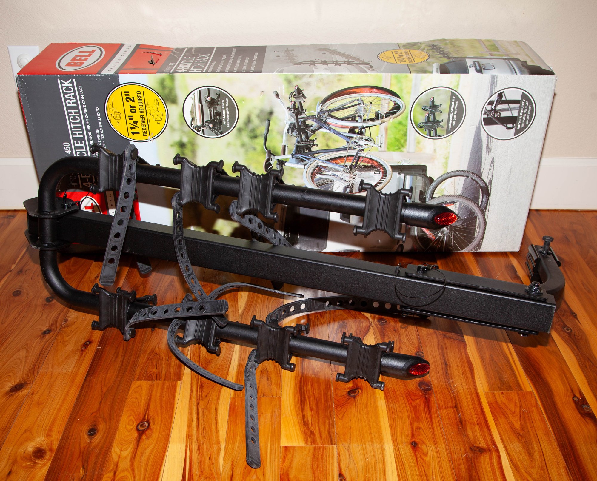 Bell Hitchbiker 450, a folding bike hitch rack designed to carry up to four bicycles. It is constructed from heavy-duty steel with a powder-coat finish for durability. Capacity: Carries up to 4 bikes, with a maximum weight of 35 lbs per bike (140 lbs total capacity).