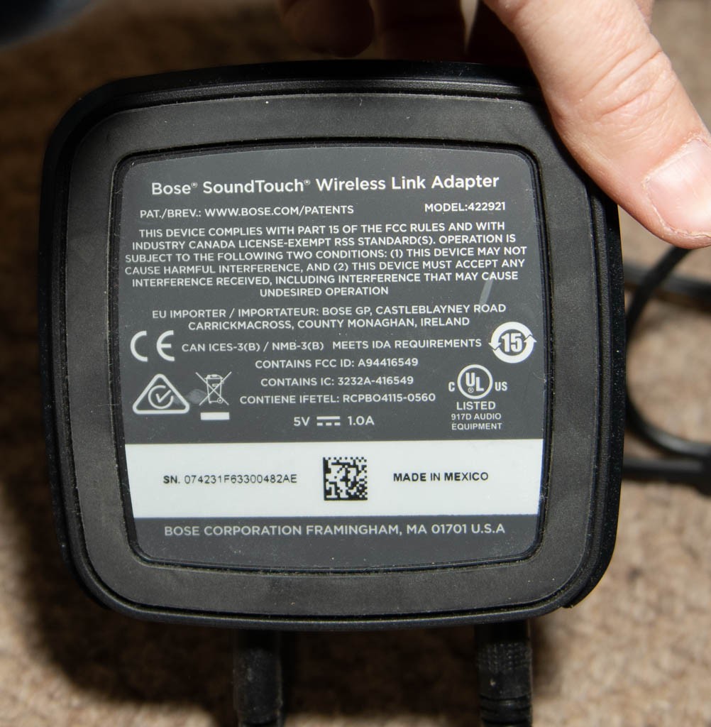 Power Supply: The smaller, gray rectangular brick on the right is a genuine Bose switching power supply (likely model S008AHU0500160) used to power the main unit.