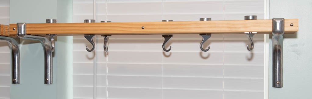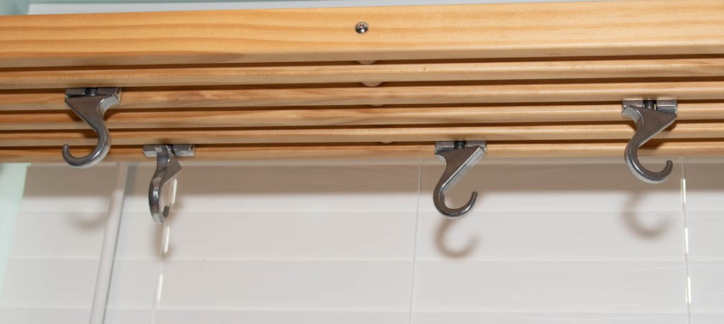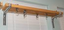Materials: Constructed with a natural wood base (typically comprising six tracks) and solid cast aluminum brackets and hooks.
