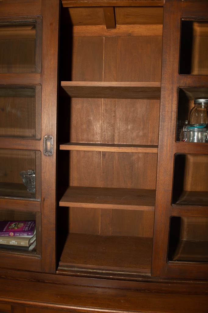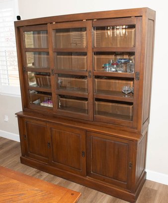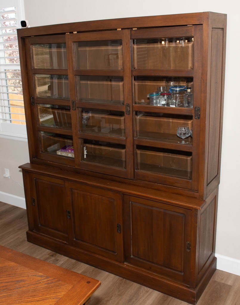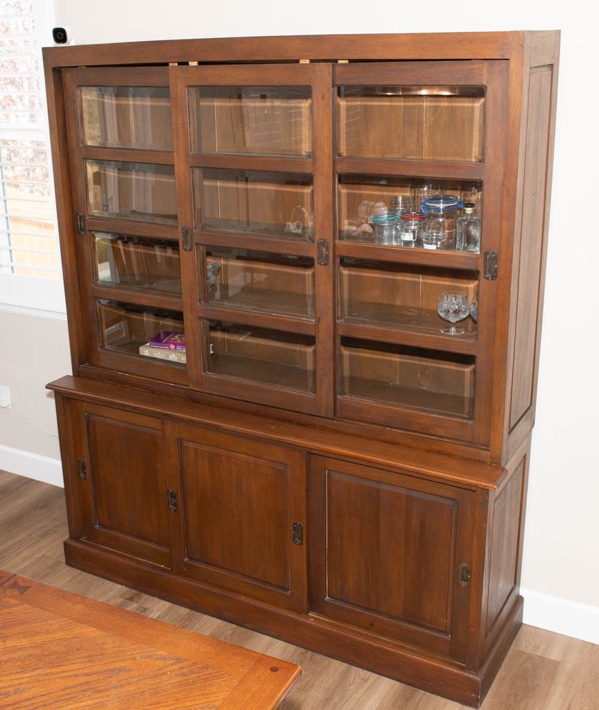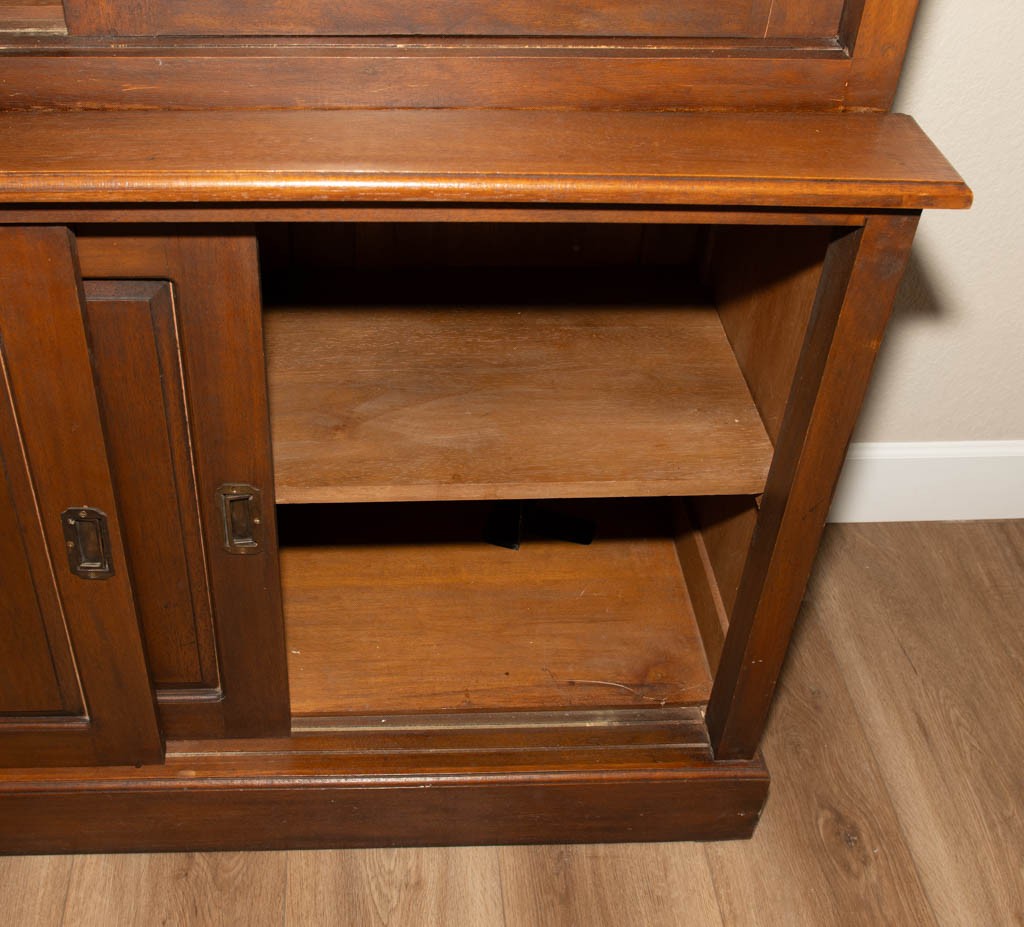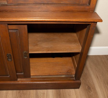 Glass-fronted sliding doors for the upper section and solid wood sliding doors for the lower storage area.