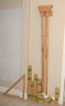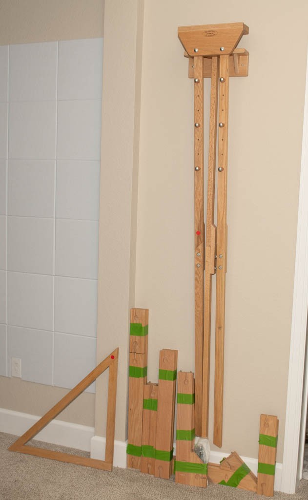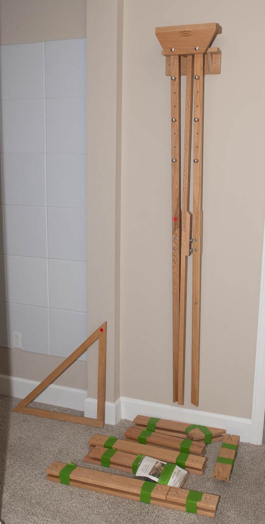 These wooden pieces are the "legs" of the triangle. Because this is a modular system, you can connect different combinations of these rails using the pre-drilled holes and hardware to create triangles ranging from small shawlettes to large wraps.