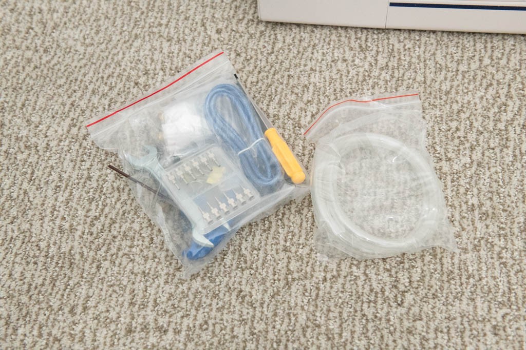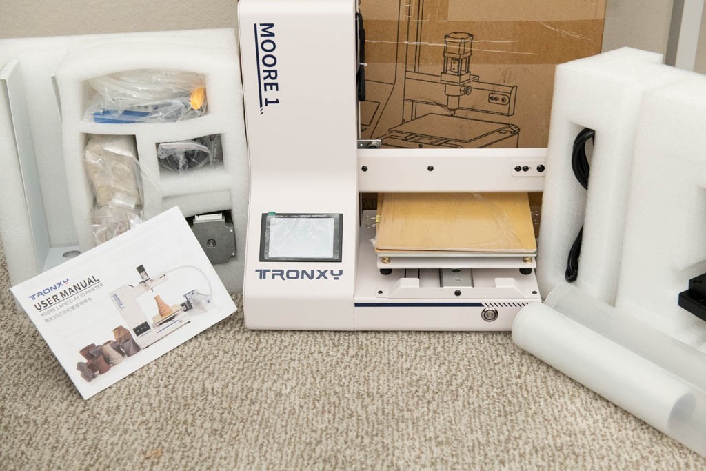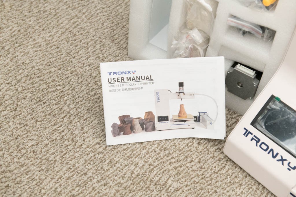 The package in your photo includes the main printer body, the user manual, foam packaging for protection, and the feeding system components like the white plastic barrels