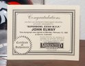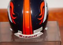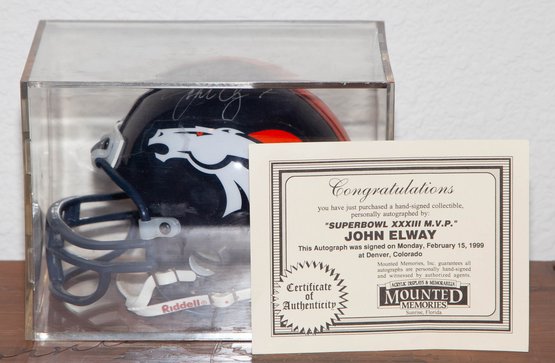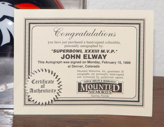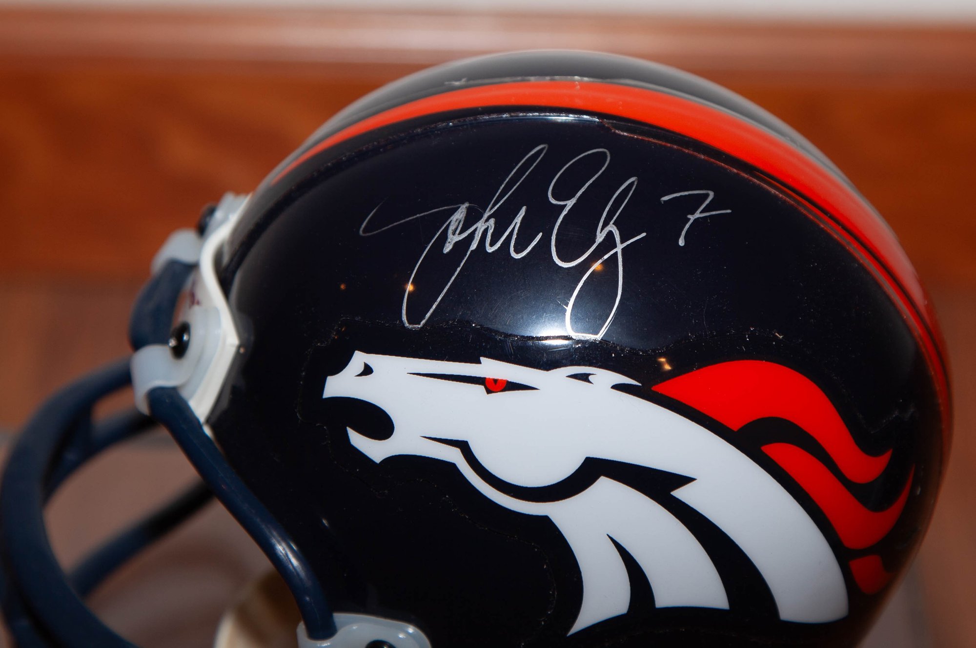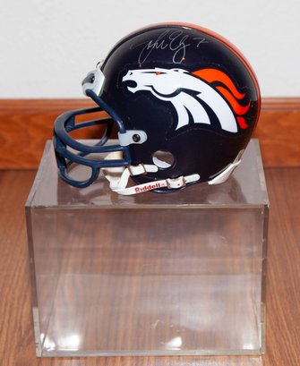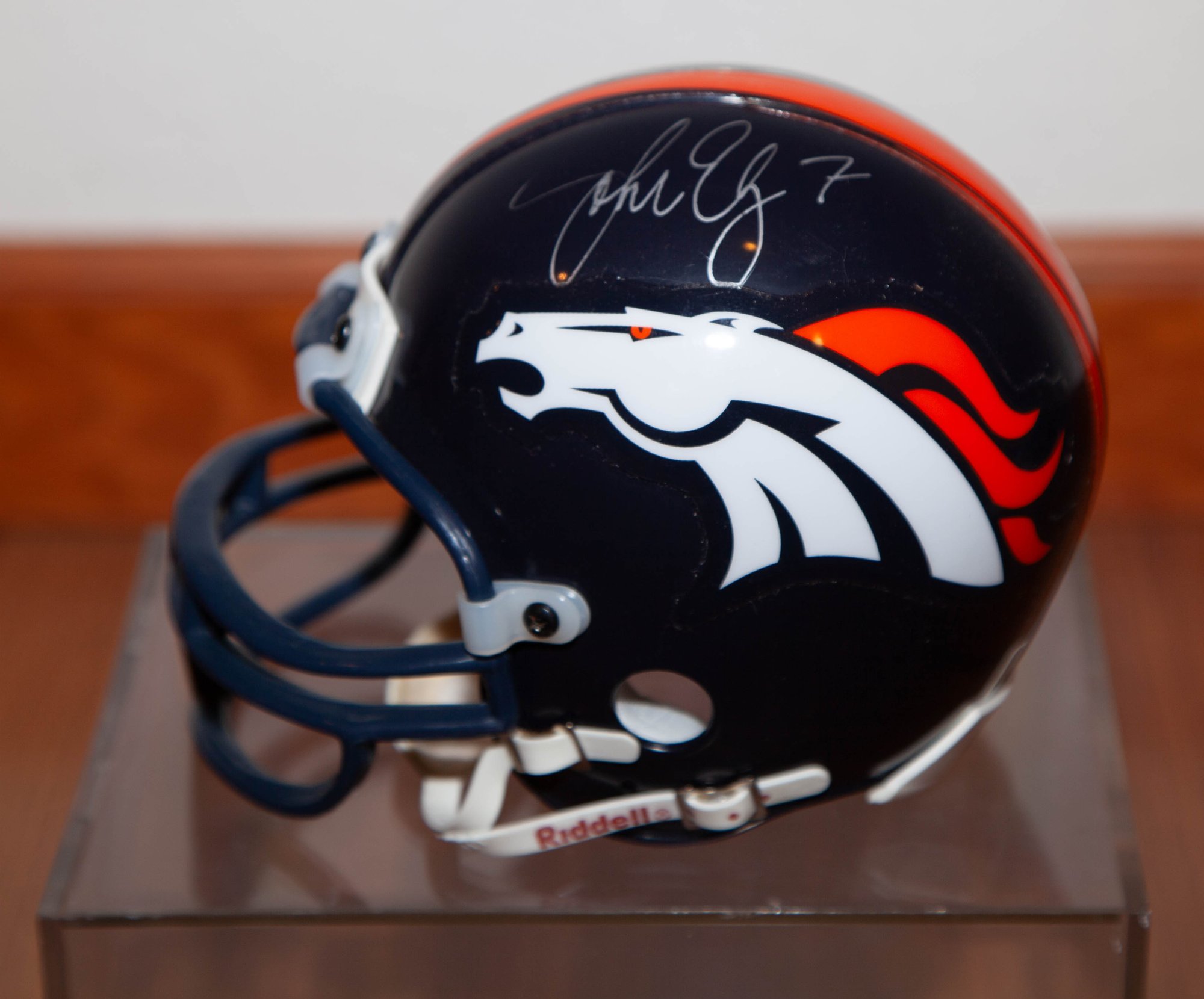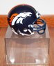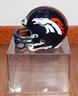 This autographed Denver Broncos mini helmet is a half-scale replica of the team’s on-field equipment, specifically the Riddell VSR-4 model used during the late 1990s and 2000s.