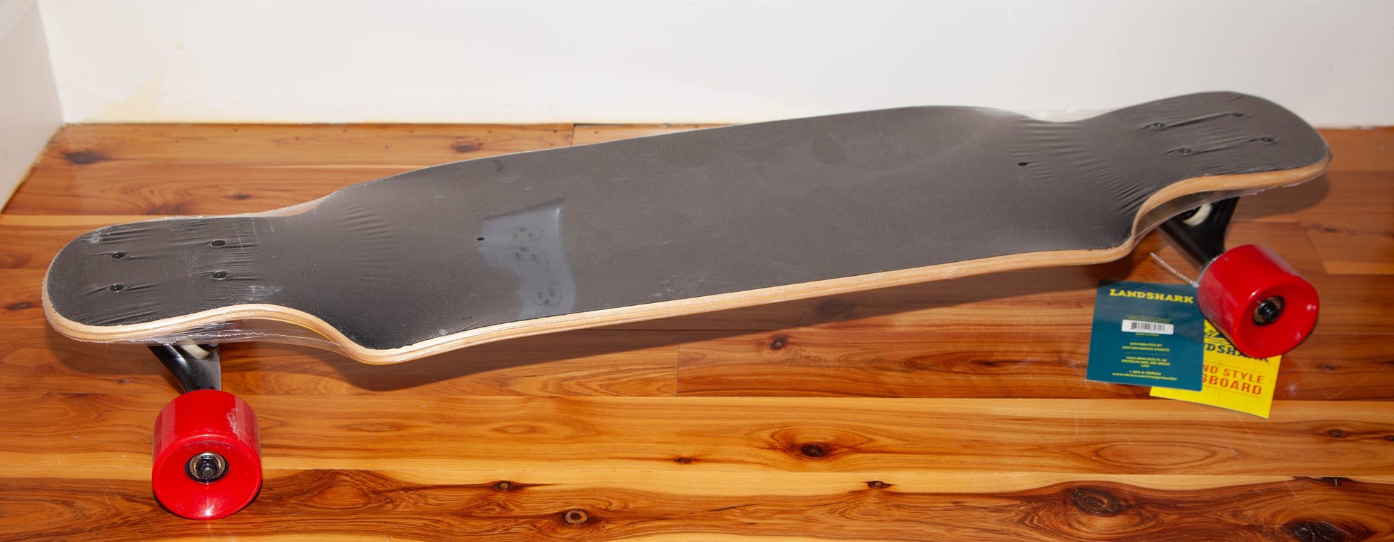 LandShark Island Style Longboard, a 35-inch complete skateboard designed for cruising and carving with a retro, surf-inspired aesthetic.