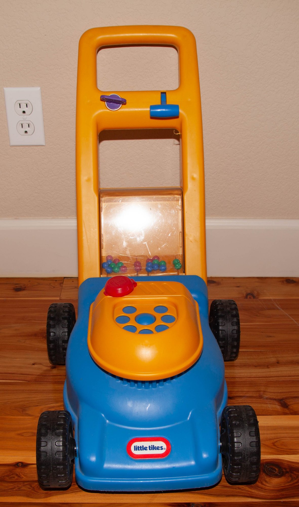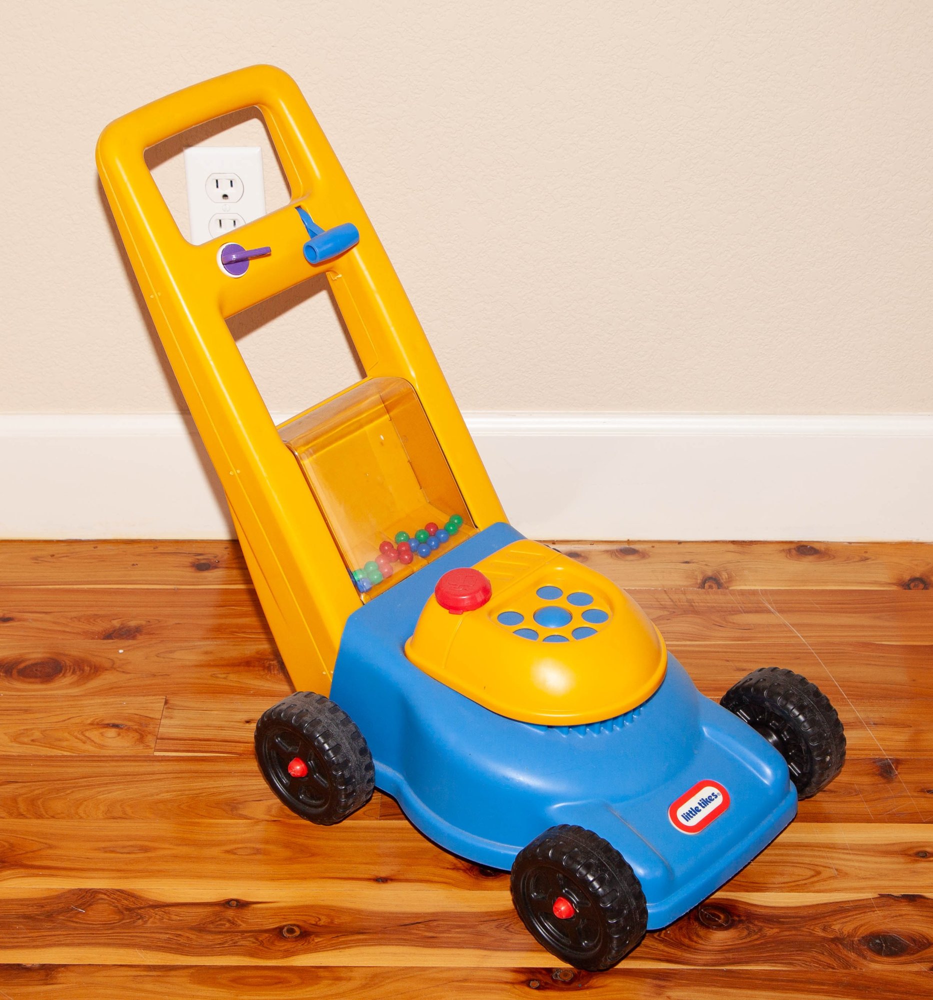 It features mechanical sounds and colorful beads that pop when the mower is pushed.