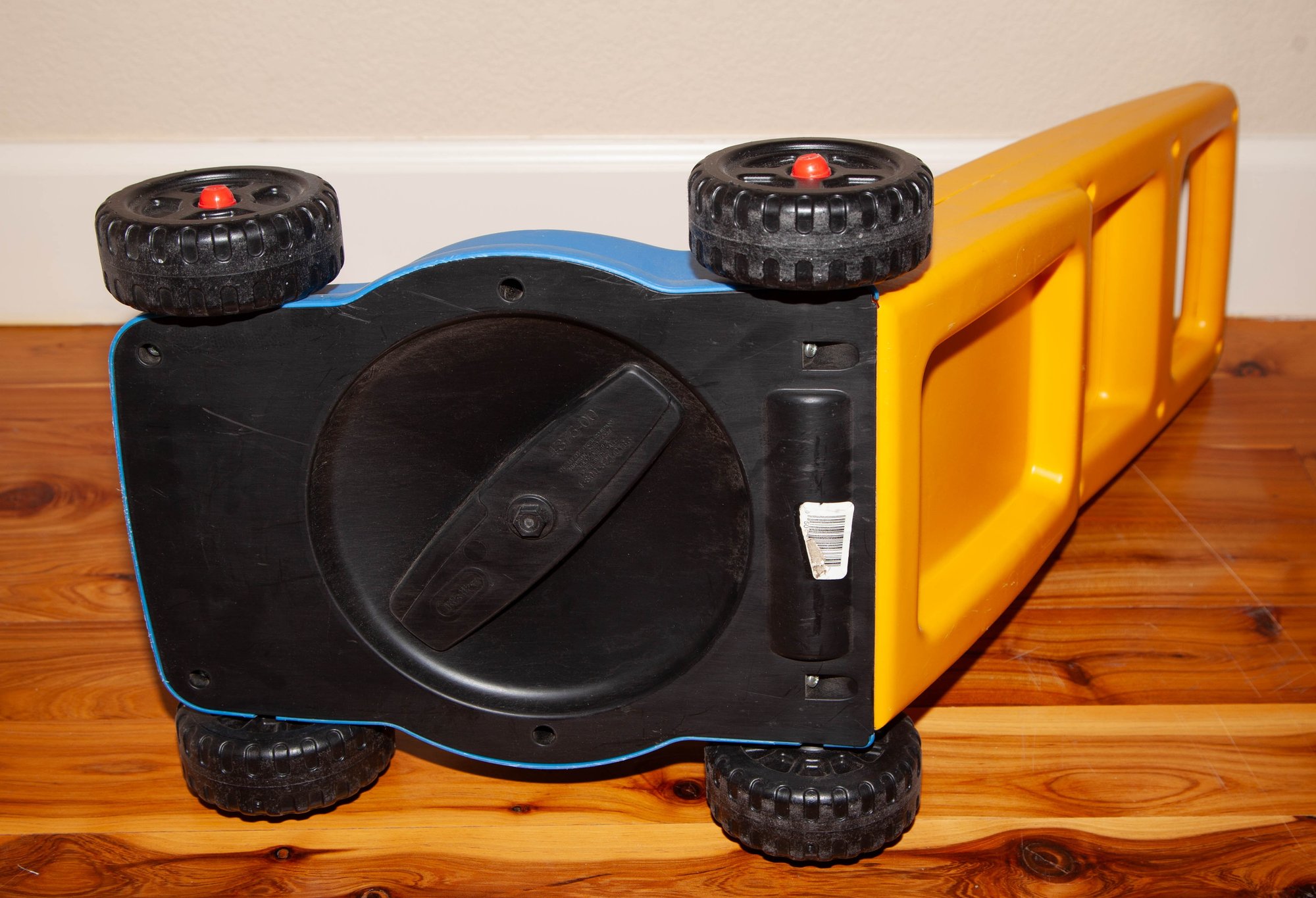 The toy is made of durable plastic and is designed to mimic real lawn mowing.
