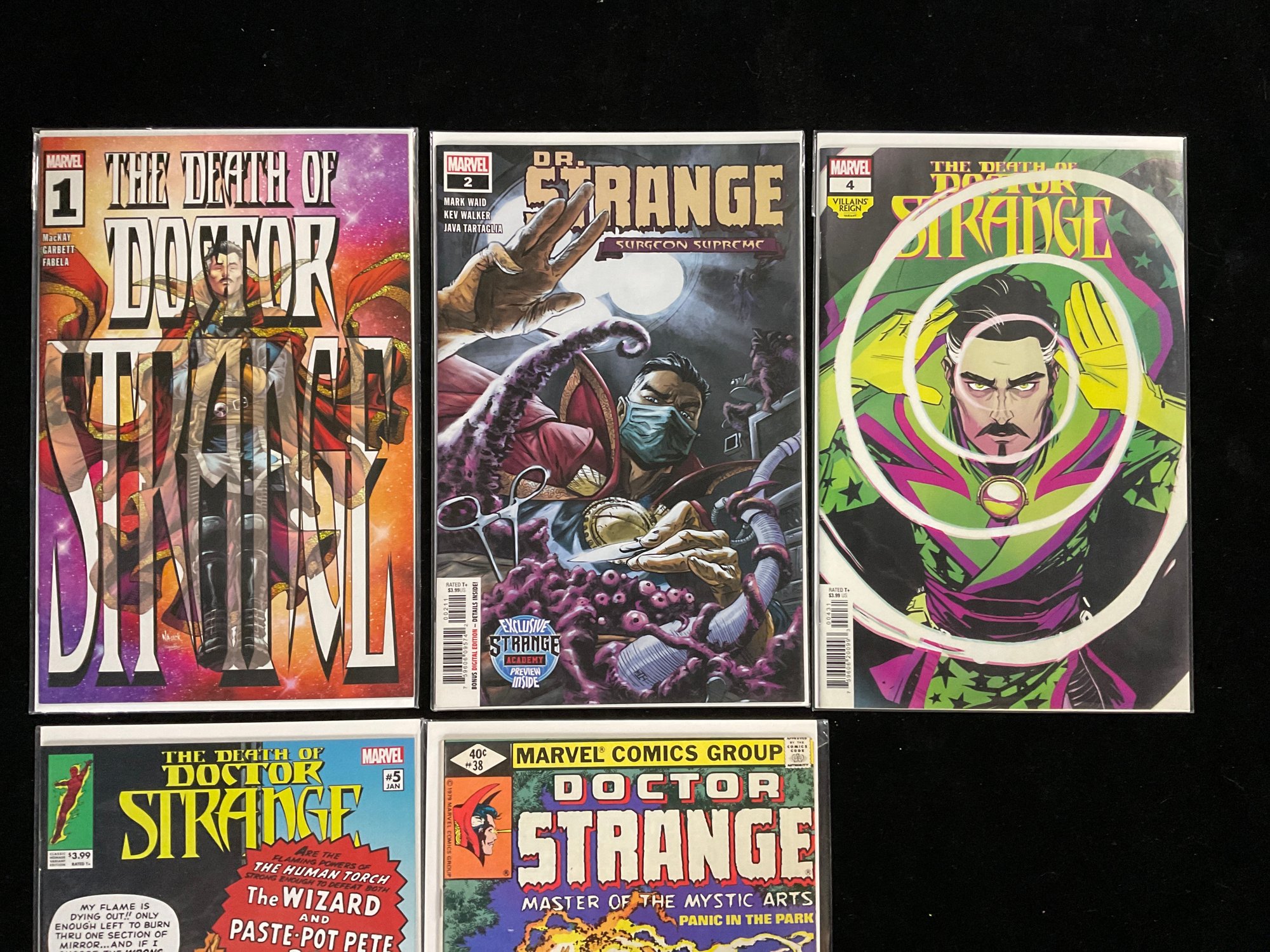 Dr. Strange: Surgeon Supreme #2 (2020): Written by Mark Waid with art by Kev Walker, this issue features Doctor Strange with a face mask, dealing with his restored surgical skills and a new mystical threat. It also contains a preview for Strange Academy.