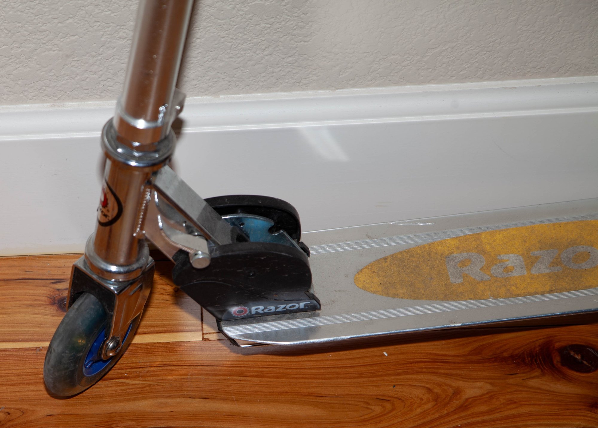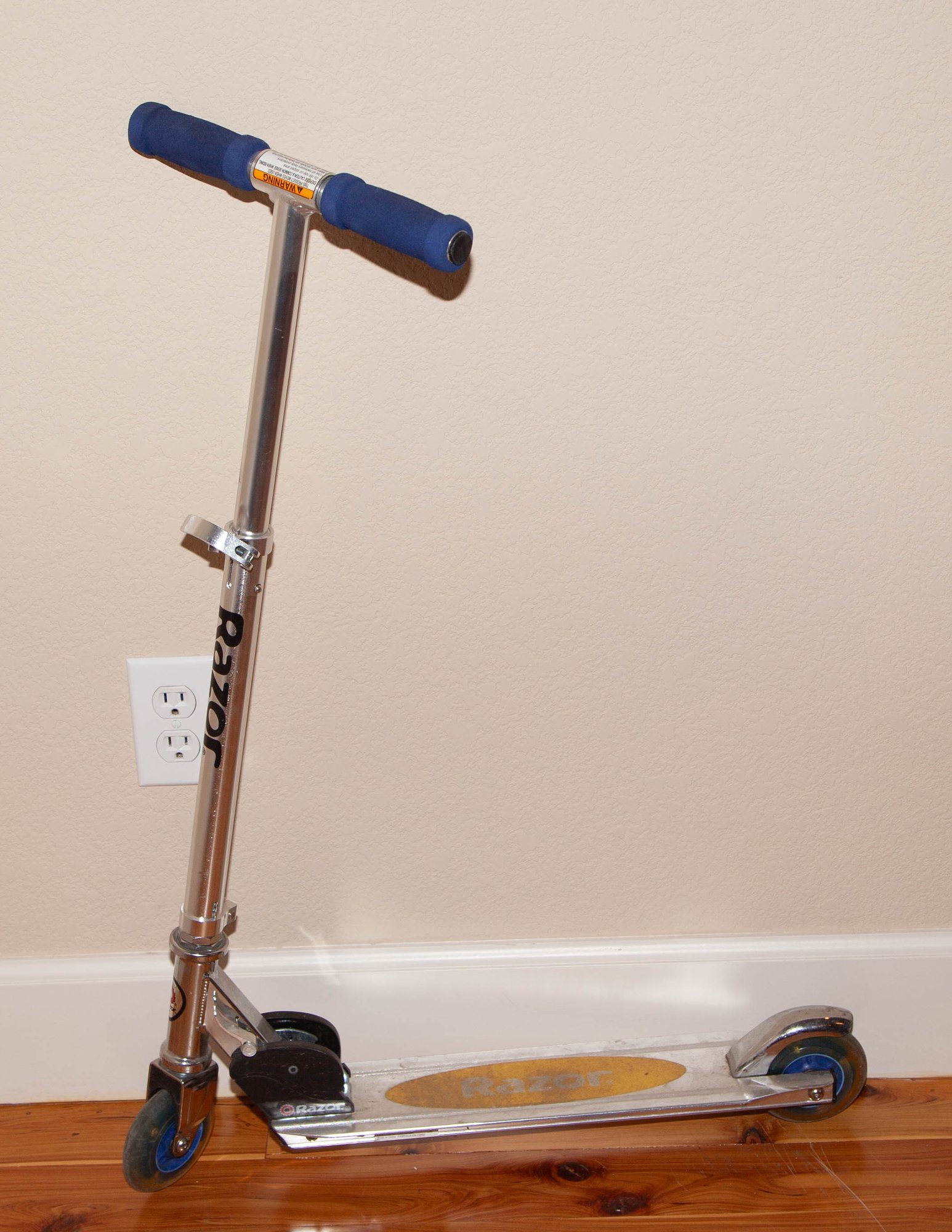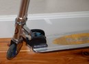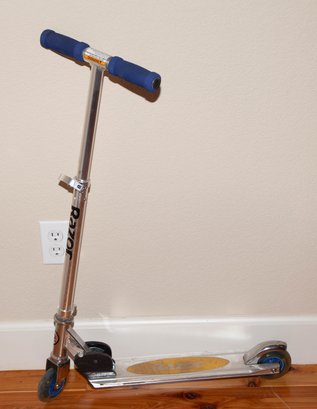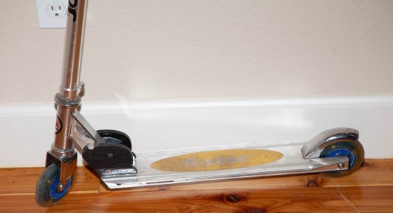 Razor kick scooter, featuring a lightweight aluminum frame and a patented folding mechanism.