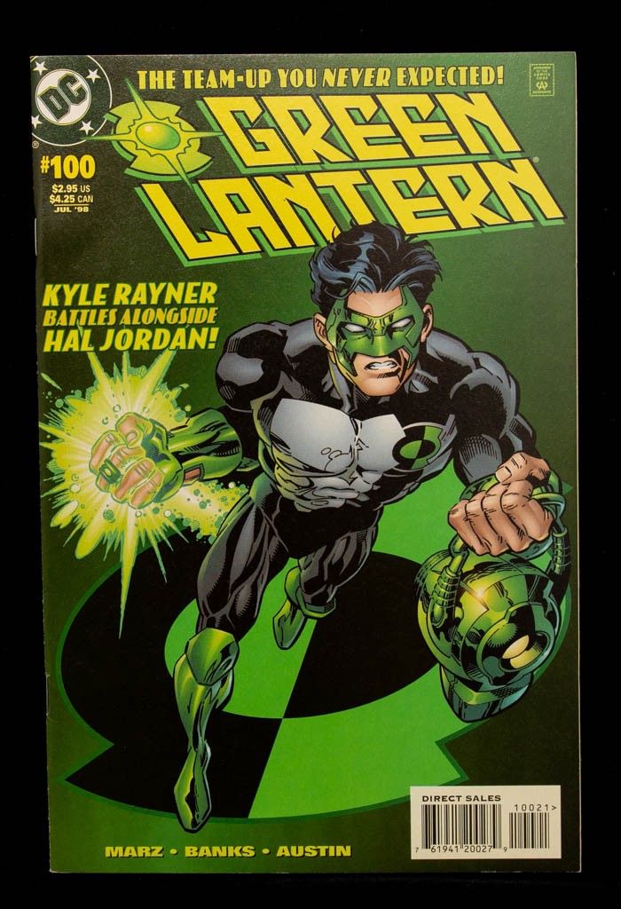This image shows the cover of Green Lantern Vol. 3 #100, a significant anniversary issue published by DC Comics in July 1998. The issue is famous for featuring a "team-up you never expected" between the current Green Lantern at the time, Kyle Rayner, and a time-traveling, younger version of his predecessor, Hal Jordan.