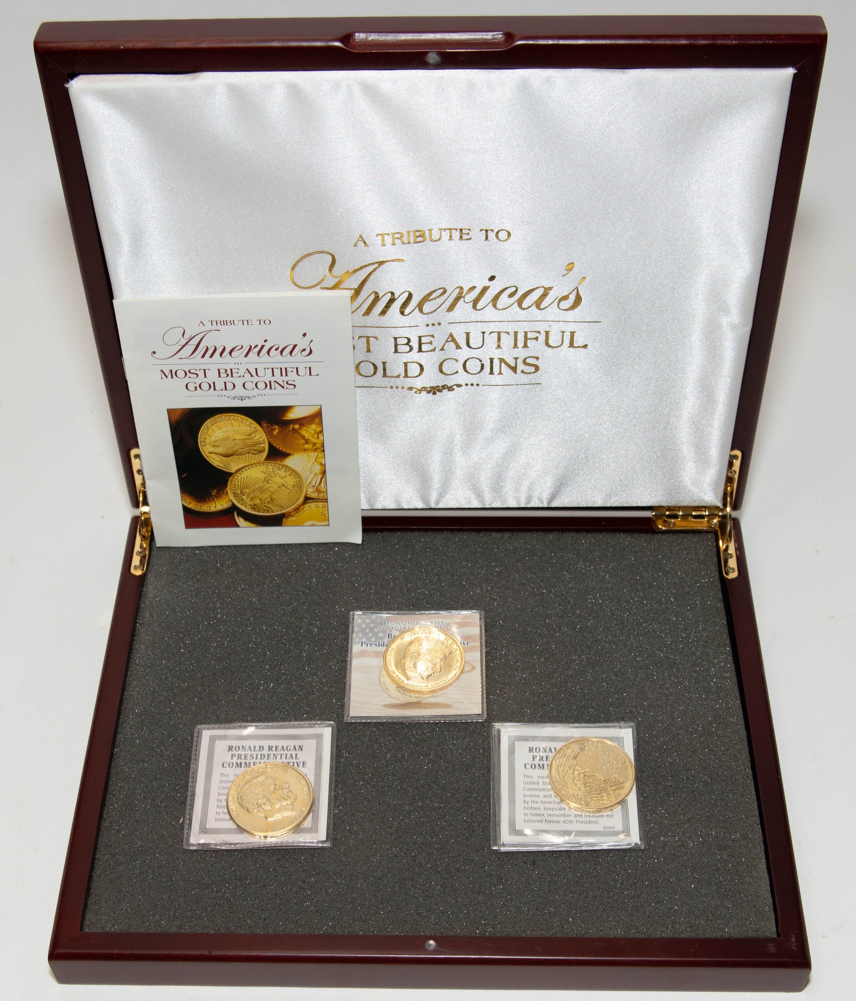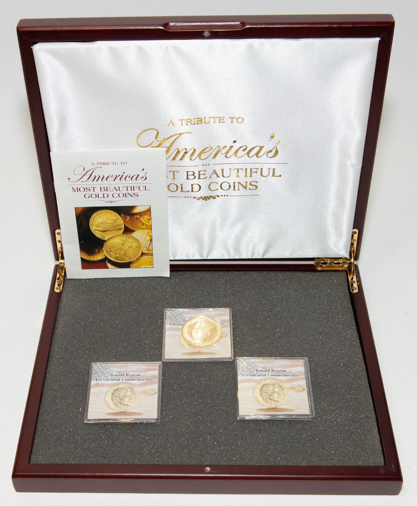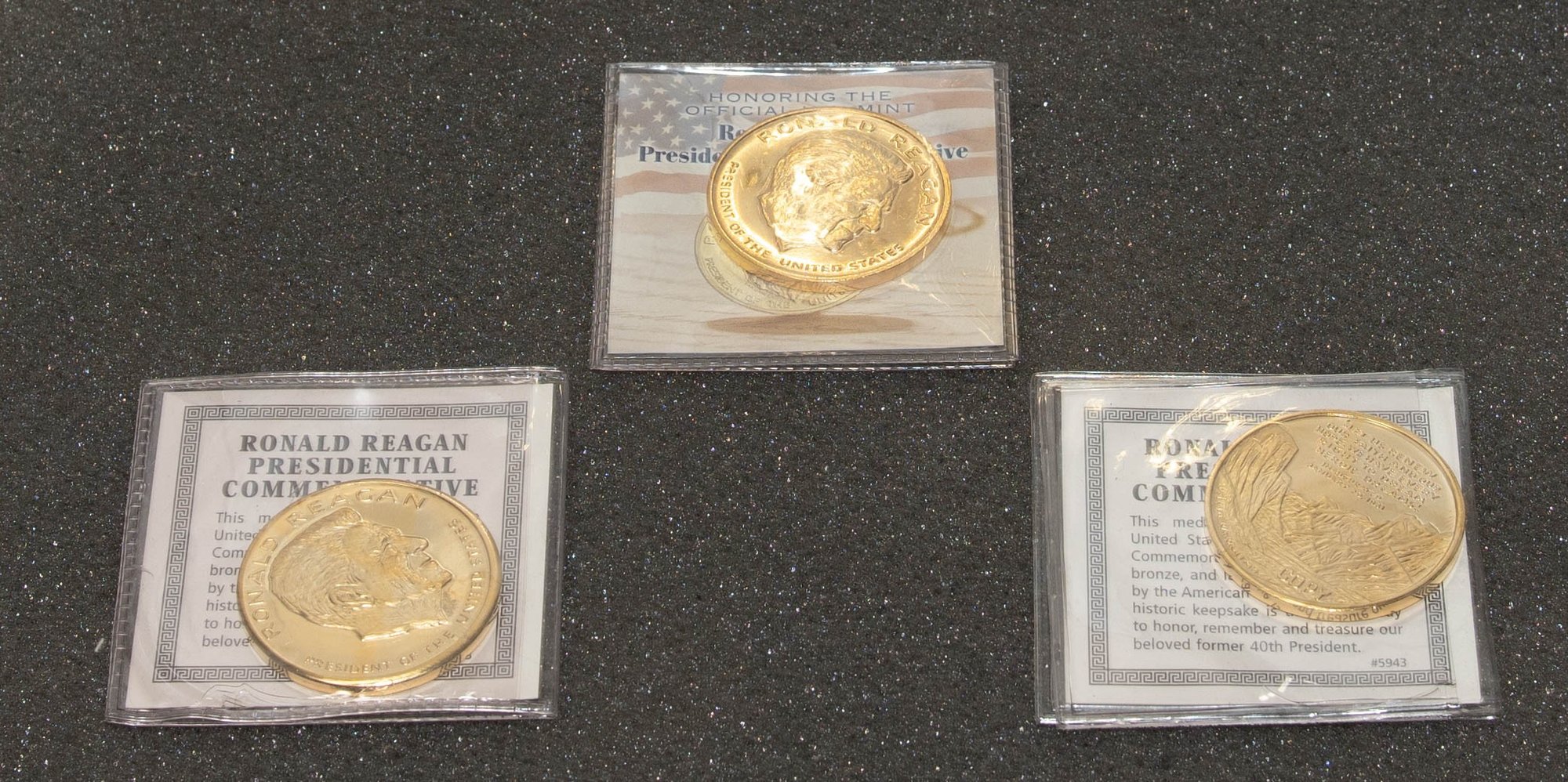 The medals are minted from solid bronze and lavishly layered in 24KT gold. Features a bust of the 40th President, Ronald Reagan, facing right, with the legend "RONALD REAGAN PRESIDENT OF THE UNITED STATES".