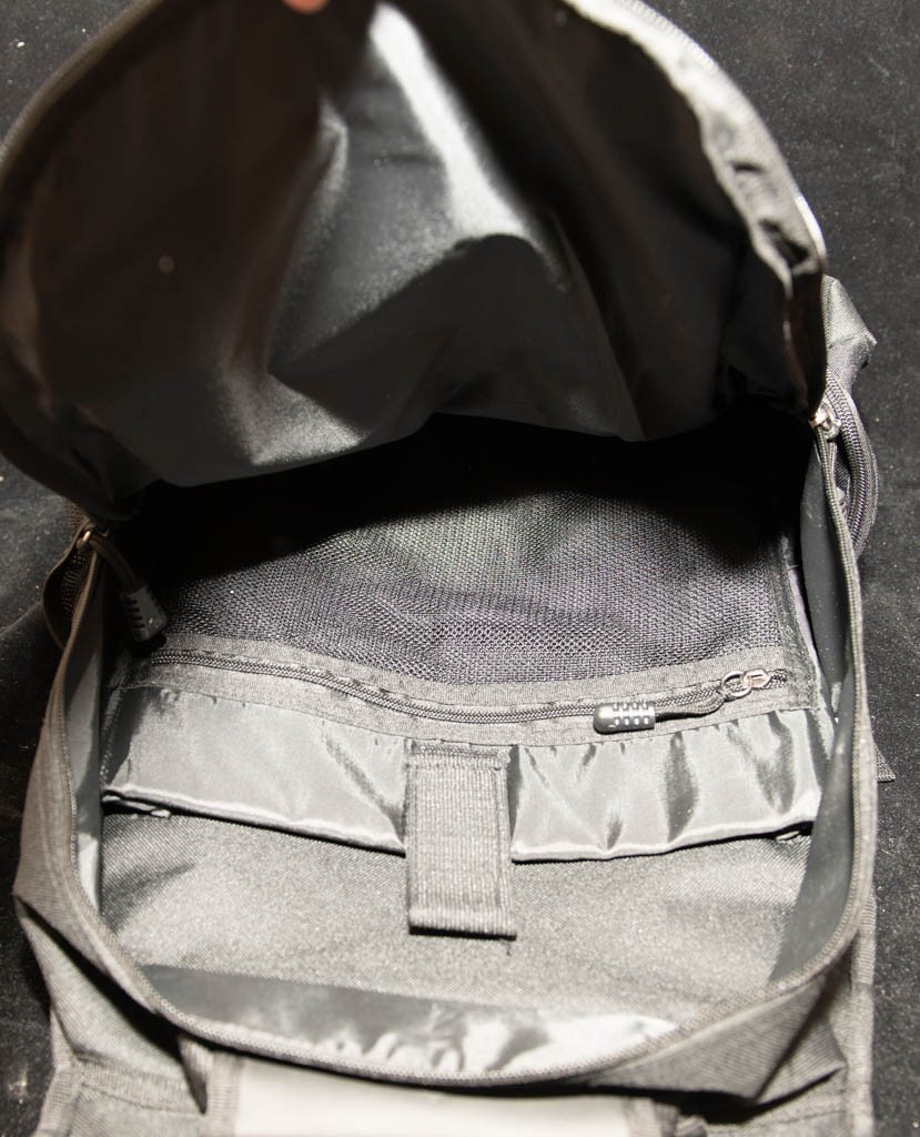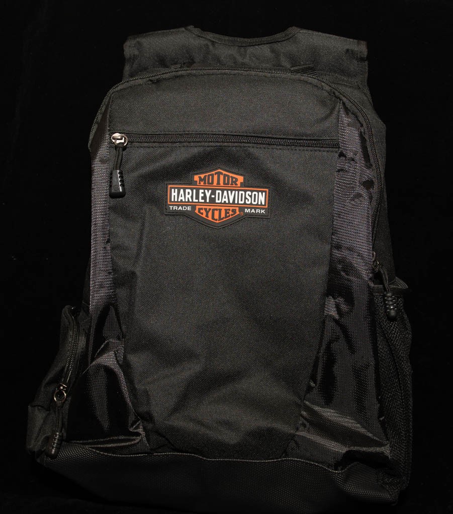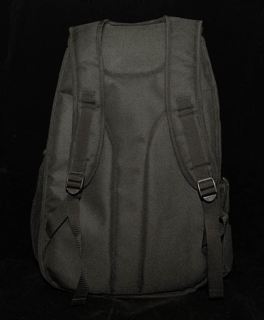 Design: A classic black travel or work backpack with silver hardware.