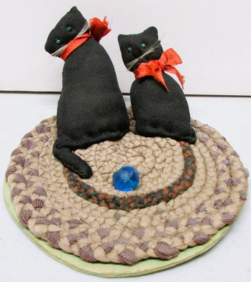 The wipe in the form of two cats sitting on a rag rug.