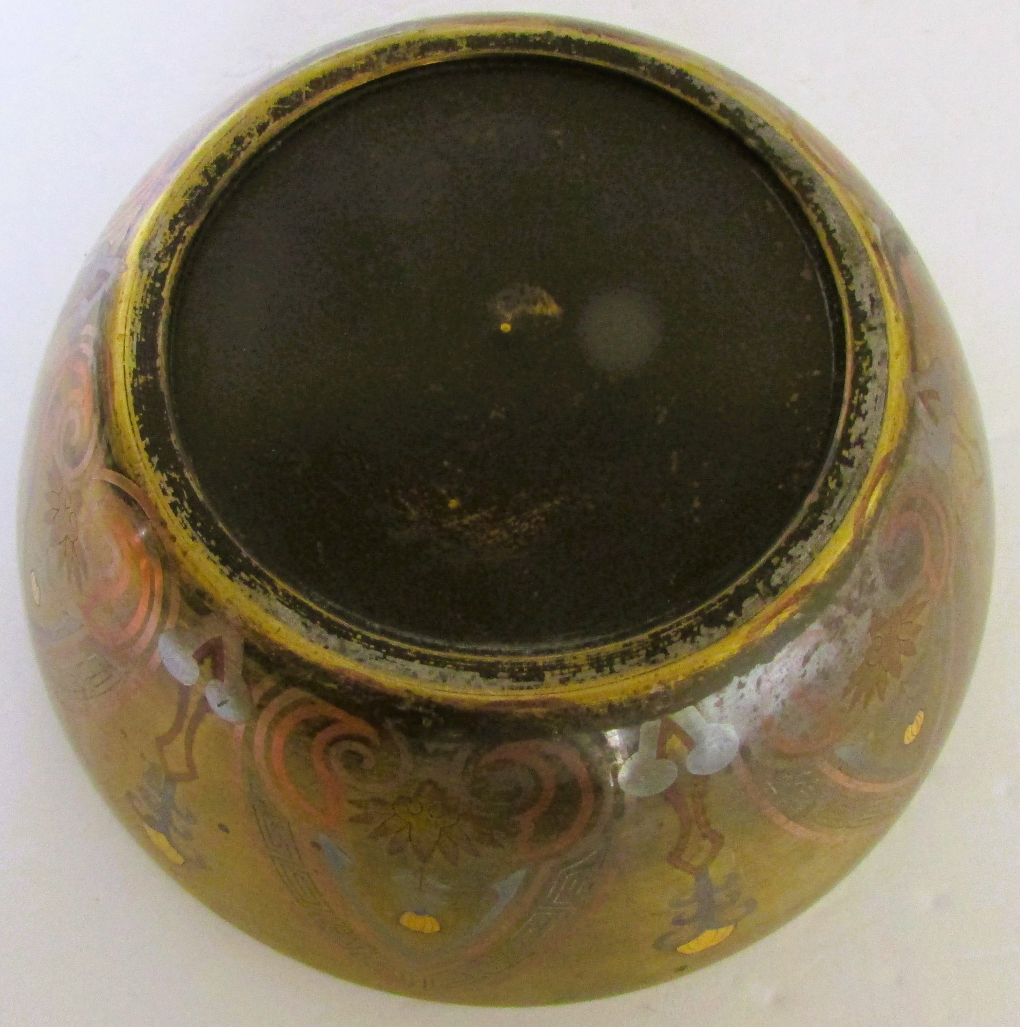 The body of the bowl appears to be hardened leather, the overlay of bands and geometrics hand applied. Unmarked.