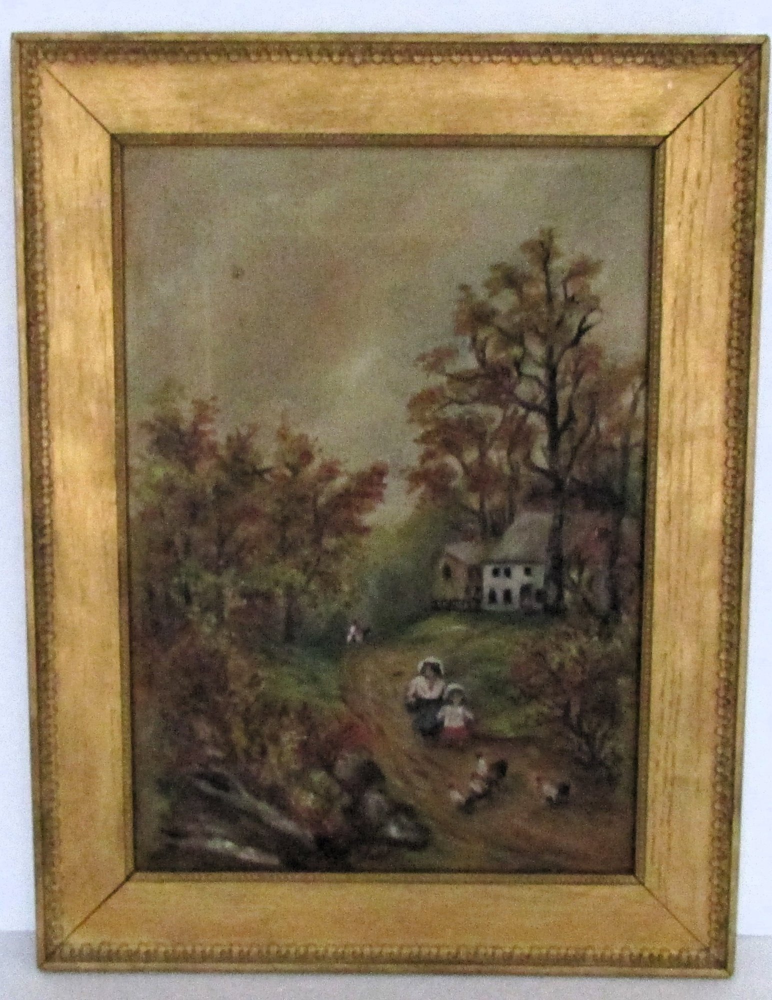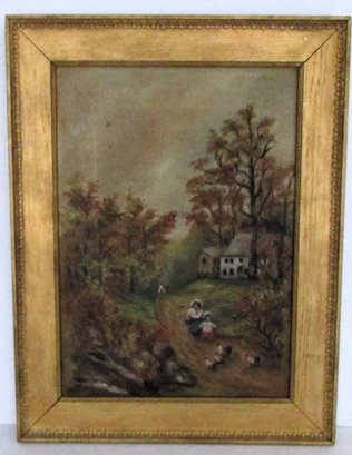 The image depicting a farmhouse with children and chickens. Unsigned. In its original gilt frame with Boston, Mass framers label.