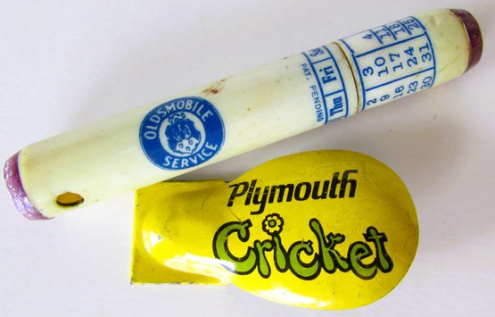 Including a "Plymouth Cricket" clicker advertising piece circa 1971 and an Oldsmobile Perpetual Calendar Pencil Holder from Beverly (Mass) Motor Sales.