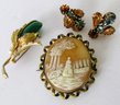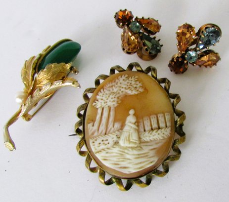 The brooch in the form of a branch with leaf, fitted with a small pearl and green stone at the tip, the reverse marked "Hattie Carnegie." The earrings of the clip on style, formed with five colored stones, the clip marked "Made in Austria," and the Cameo of traditional form with Classical scene and gold plated frame, unmarked for content.